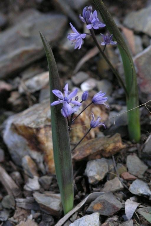 As flores que nesta altura mais se destacam na paisagem são as de carqueja e as de tojo, duas plantas do matagal lenhoso. Ambas pintam a paisagem de um amarelo vivo, que atrai o olhar, mesmo ao longe. No local onde andávamos, não havia muito tojo mas sim alguma carqueja, essa planta “humilde” e frugal, tão desprezada, mas tão cheia de virtudes e de usos úteis ao homem. Entre as herbáceas, havia contudo agora uma flor que ocorria com abundância naquele local: trata-se da cila-de-uma-folha (Scilla monophyllos), pequena planta bolbosa com uma flor de cor azul, também conhecida por cebola-albarrã (“Planta bolbosa rica em substâncias activas e mesmo tóxicas. É diurética e expecturante. Externamente usam-se as escamas do bolbo (em verde) pisadas e formando cataplasma, aplicadas três ou quatro vezes ao dia cura os joelhos de àgua.” Com um obrigado à Rosa [http://cheirar.blogspot.com]). Outra planta que chamava a atenção pelas suas flores intensamente azuis era a Lithodora prostata (erva-das-sete-sangrias). Também o lentisco se encontrava em flor, mas este já na sua fase final de floração.