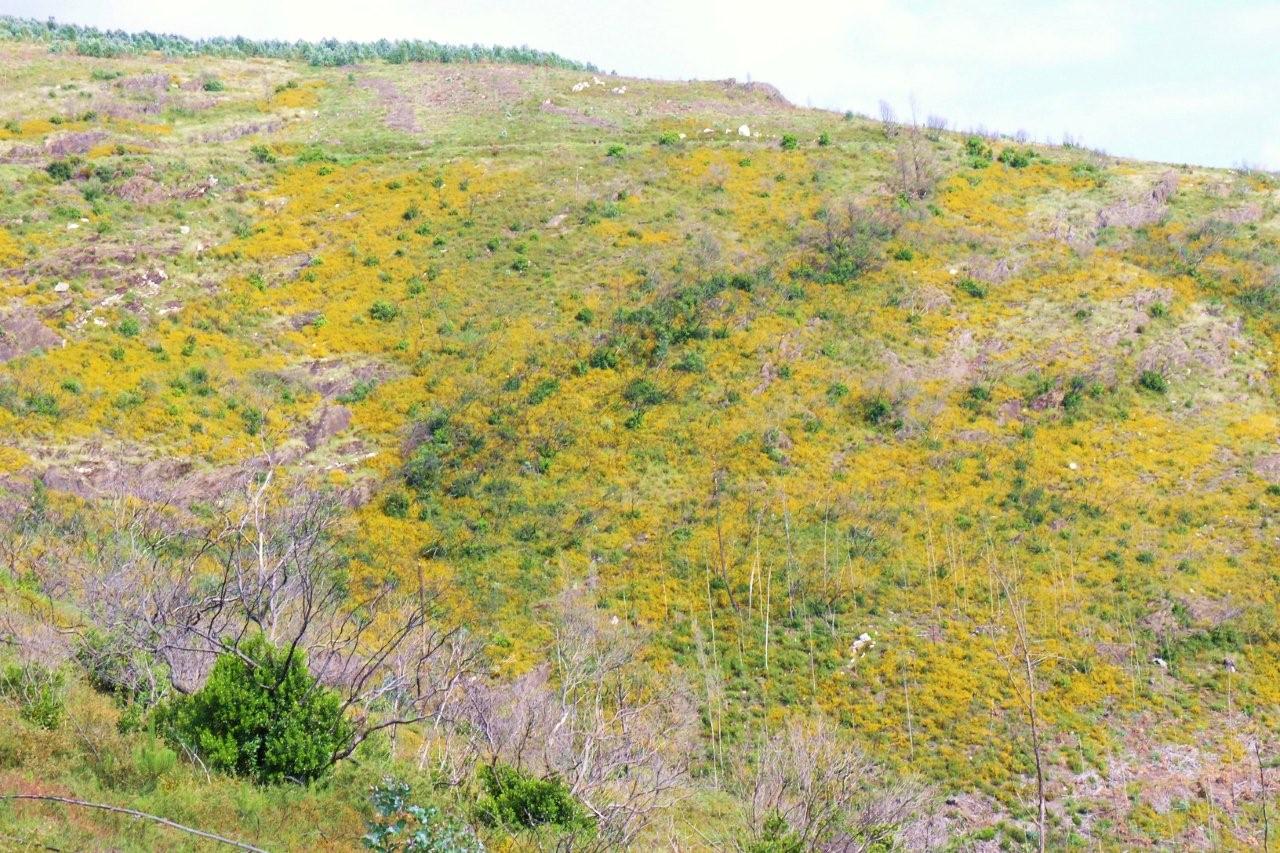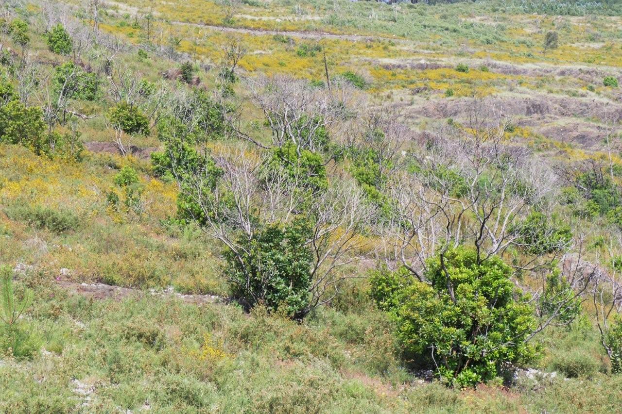 O amarelo dos tojos da espécie Genista triacanthos domina ainda as zonas onde o matagal é predominante, dando à paisagem uma tonalidade amarela, visível mesmo da povoação (4). Nos locais onde o medronhal é mais vigoroso, como na propriedade da Quercus, os medronheiros atingem já mais de 2 metros de altura, mas ainda não escondem os ramos queimados em 2005 (5). É interessante ver a extrema da propriedade da Quercus e de como a paisagem de cada um dos lados causa uma impressão diferente (6).