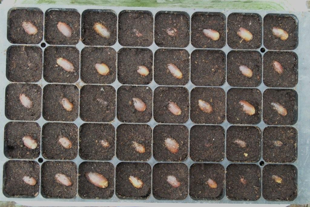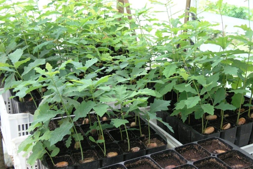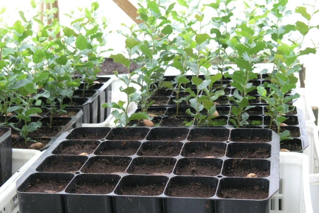 (1) bolotas de sobreiro hoje semeadas (tabuleiro de 40 plantas) (2) Sementeira recente em tabuleiro de 20 plantas e plantas mais antigas (3) Carvalho roble em tabuleiros de alvéolos