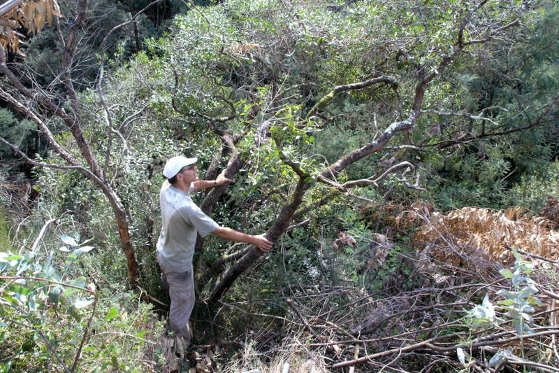 Depois de um almoço em forma de piquenique e algumas fotos de reconhecimento a esta maravilhosa árvore, antes de deixar o carvalhal ainda colhemos alguns frutos de loureiro, embora na maior parte ainda se encontrassem verdes. Foi tempo então de rumar ao Cabeço Santo para colher frutos do monte. Primeiro de aderno, numa planta que se encontra numa zona muito escarpada perto do Ribeiro de Belazaima. O arbusto, o único aderno conhecido com fruto por estas paragens, encontra-se de facto carregado, mas a maior parte dos frutos está inacessível, com verdadeiro risco de grave queda para quem se aventurasse a colhê-los. Por isso colhemos apenas algumas dezenas em local menos perigoso. Esta área tem muita madeira de eucalipto queimada espalhada pelo chão o que, juntamente com a sua morfologia, torna o acesso difícil. Também há imensas mimosas que, após o corte recente a que foram sujeitas, rebentam agora abundantemente. Um desafio para as próximas acções a realizar aqui.