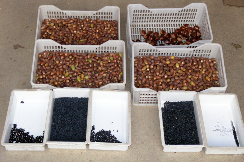 Neste dia procedeu-se à colheita de frutos para extracção de sementes. A pequena equipa voluntária começou por se deslocar até ao Parque da Senhora das Preces na Póvoa do Vale do Trigo para colher bolotas de carvalho roble. Este é um pequeno parque junto à capela local, com alguns carvalhos certamente centenários. Embora com características de parque de recreio, sem sub-bosque nem outras plantas características do carvalhal, as árvores são de porte considerável e algumas têm uma boa produção. Depois passámos ao carvalhal do Valinho Turdo, em Belazaima, um carvalhal em recuperação desde há 15 anos, onde a maior parte das árvores são relativamente jovens, embora algumas com boa produção.