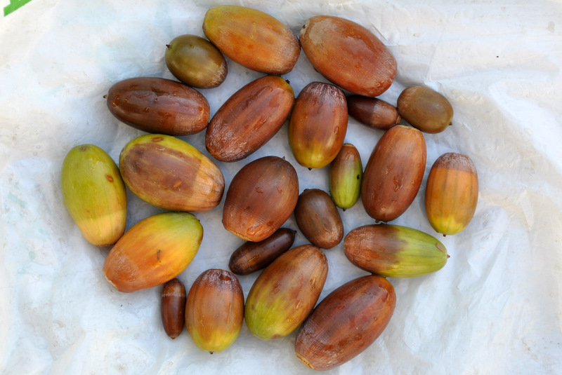 A manhã foi dedicada à colheita de bolotas no carvalhal do Valinho Turdo – Pedreira – Ponte Nova, em Belazaima. A abudância era grande pelo que era difícil escolher as melhores árvores. Foi interessante reparar como diferentes árvores, ainda que da mesma espécie, e mesmo sub-espécie (trata-se de facto, sempre, de Quercus robur subsp. broteroana) dão origem a bolotas de tamanhos, formas e mesmo padrões tão diversos. A tendência foi para a colheita dos maiores exemplares, já que têm maior quantidade de nutrientes e certamente que serão capazes de dar mais força à jovem árvore após a sua emergência. Mas procurou-se colher de uma diversidade de árvores-mãe em zonas com diferentes condições de solo e humidade.