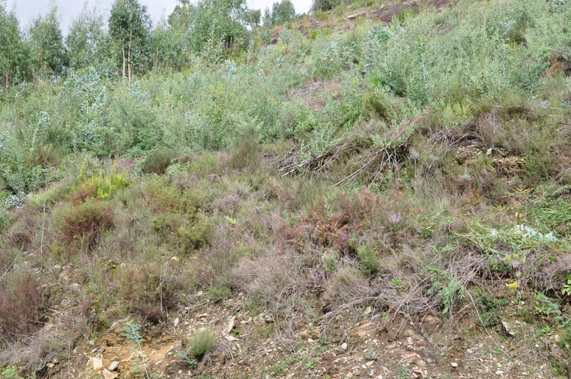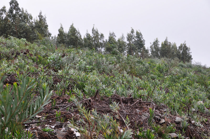 A jornada de 7 de Novembro contou com a participação de dois jovens estreantes nestes trabalhos, vindos da cidade de Aveiro. Os planos para este dia começavam com um período de trabalho naquela área onde a densa cobertura de acácias foi “tratada” com uma grade de discos. O tempo estava variável, mas, cá em baixo, até parecia estar a ajudar. Por isso, o pequeno grupo subiu o monte confiante. Só que, lá em cima, vencido um desnível de 300 metros, as coisas eram bem diferentes: um forte vento frio varria a encosta com uns salpicos de chuva de vez em quando. No entanto, não era caso para desistir logo. Durante uma hora e meia cortaram-se e arrancaram-se plantas de Acacia longifolia numa área já iniciada num fim de semana anterior. Só que, à medida que a manhã decorria, parecia que o vento soprava cada vez com mais força e os salpicos de chuva, embora escassos, chegavam aos ossos. Deste modo, aí pelas 11:30h decidiu-se procurar paragens menos agrestes e abandonar aquele local. Uma foto final ilustra o panorama nessa altura.