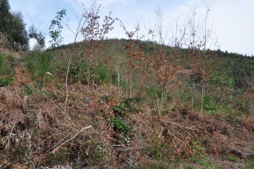 Entretanto, no Cabeço Santo, alguns trabalhos têm continuado, em particular os de selecção dos rebentos de carvalho, que permitirão obter árvores bem constituídas e de tronco único a partir dos rebentos que brotaram a partir dos sistemas radiculares das árvores queimadas. Na área onde se realizou a anterior jornada voluntária esses trabalhos estão já concluídos, como documentam as fotos seguintes.