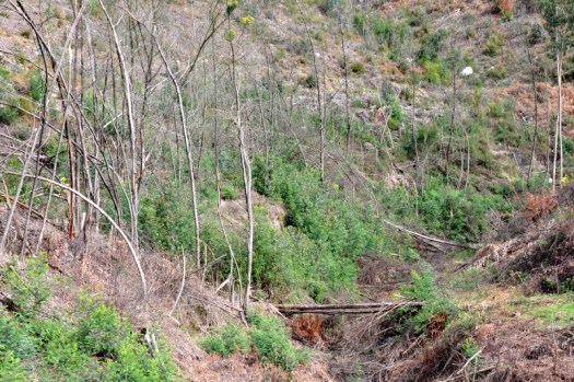 Na primeira foto ainda podem ser observadas muitas mimosas entre os carvalhos, que não puderam ser pulverizadas para não comprometer os carvalhos. Estas mimosas terão agora de ser controladas por corte repetido, um trabalho para a Primavera… Logo ali a montante, nas margens do ribeiro as mimosas ainda ocorrem também com grande densidade, mas aqui ainda deverão ser pulverizadas logo que as condições o permitam, pois que se trata de rebentos do ano passado que não puderam ser pulverizados no Outono.