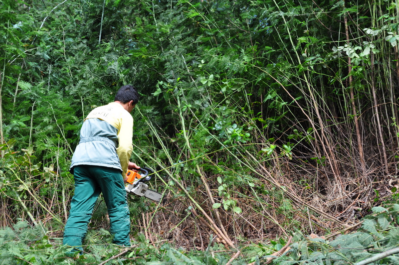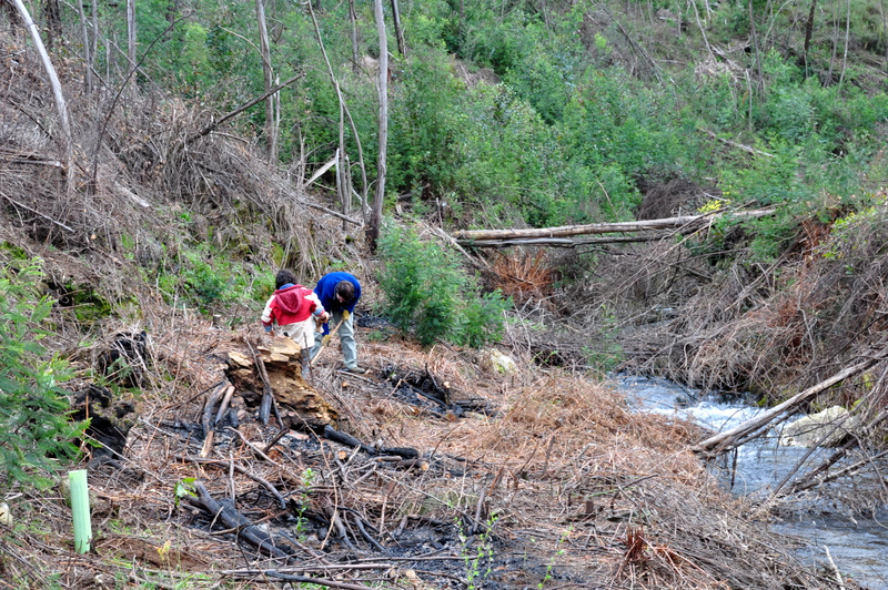 A margem sul do Ribeiro neste local já duas semanas antes tinha sido plantada com salgueiros. A margem norte estava ainda coberta com uma enorme quantidade de lenha seca, que entretanto foi arrumada e mesmo queimada para deixar espaço livre para as plantações nesta margem. Por isso, um dos trabalhos da equipa logo pela manhã foi plantar esta estreita faixa com salgueiros mas também carvalhos e azevinhos, loureiros, e outros arbustos. Mas ainda antes disso era necessário passar para o outro lado do Ribeiro. Uma ponte improvisada não deixou de ser um desafio para quem via passar as águas frias uns centímetros abaixo dos pés…!