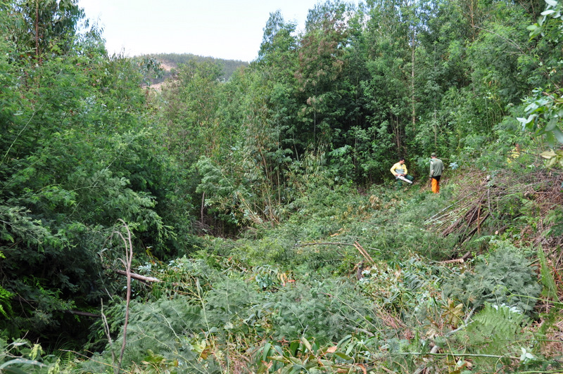 Como nem tudo pode ser perfeito, neste Sábado apenas três voluntários se reuniram para realizar mais uma jornada de plantação de árvores e arbustos no Cabeço Santo. O dia estava frio e ventoso, mas nada que demovesse os voluntários mais determinados. De novo se rumou à área imediatamente a jusante da confluência do vale 6 com o Ribeiro, uma área ainda há menos de um ano revestida de uma densa e impenetrável formação de acácias e eucaliptos. Duas imagens tiradas em Maio de 2009 dão uma ideia de como era nessa altura…