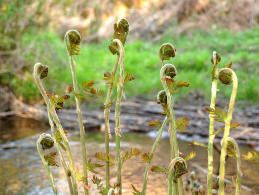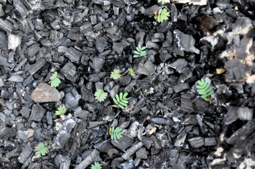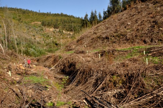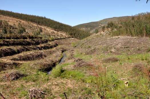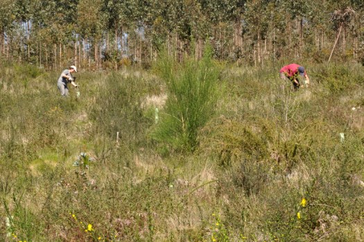 A meio da tarde descemos ao Ribeiro para colocar estacas junto aos arbustos plantados. As plantas herbáceas com flores, ainda há um ano completamente ausentes desta paisagem, fizeram a sua aparição. E com elas, as borboletas. Os carvalhos, também com as suas discretas flores verdes (uma excepção, no reino vegetal?), começam agora a revestir-se do seu manto de folhas. O Ribeiro, muito, muito convidativo, acendia a imaginação dos voluntários, e, junto a ele, os fetos renasciam do interior da terra. Num local onde se havia realizado uma queimada de um monte de lenha, reparámos como inúmeras pequenas plantas de mimosa emergiam do solo! Apesar da elevada temperatura que a sua superfície atingiu, muito maior do que num incêndio florestal!