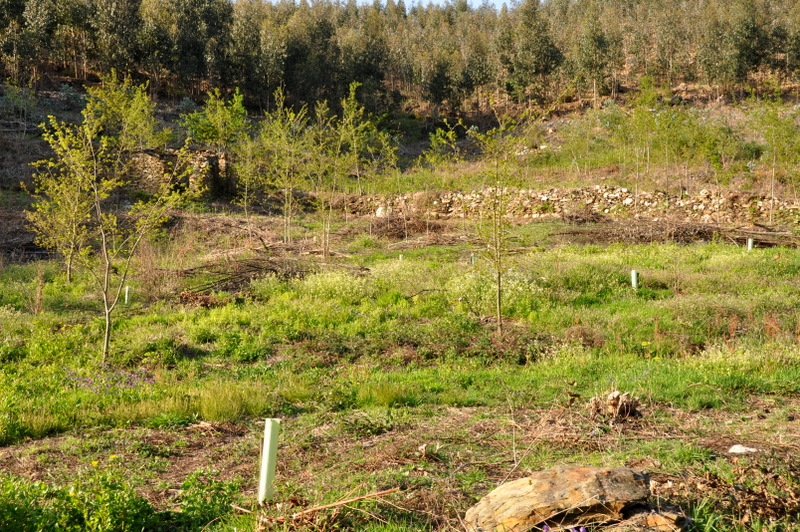 O dia começou com alguns contratempos, mas com um pouco de paciência, foi-se “levando a água ao moinho”. Foi necessário começar por arranjar os tutores, cortando acácias e afiando-as com um machado. Depois, a deslocação até ao Cabeço Santo, começando pela primeira área de plantação do Inverno. Todas as árvores e arbustos aqui plantados estavam de boa saúde…