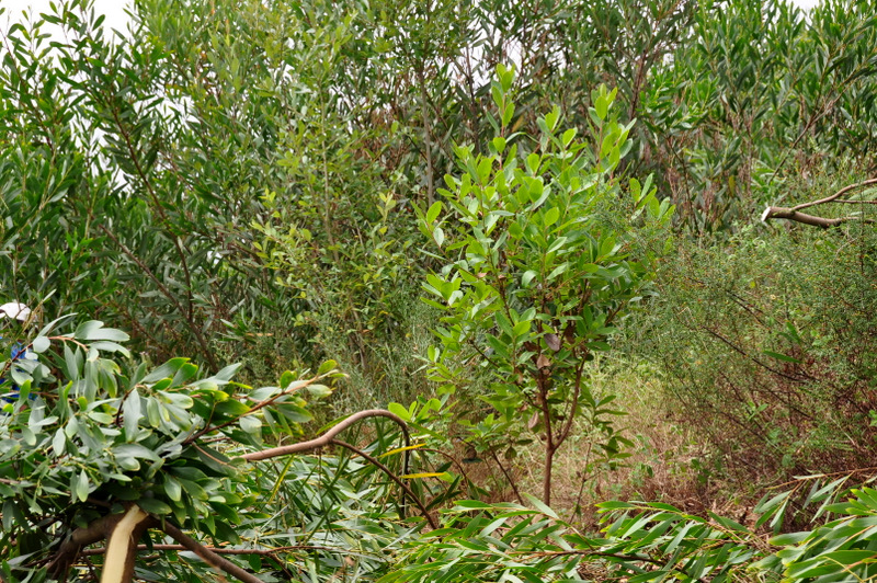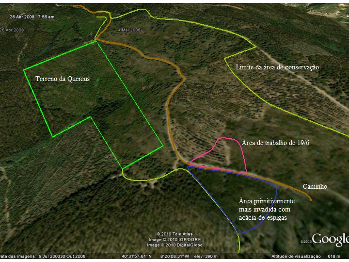 Do lado de cima do caminho florestal, mais agreste mas com mais vegetação nativa, a intervenção abrangeu praticamente toda a área não plantada, enquanto que abaixo do caminho apenas se abriram umas “galerias”, tentanto compartimentar a mancha. Só em 2009 toda a área abaixo do caminho foi cortada, mas com motoserra, o que deu origem a extensos rebentamentos. Acima do caminho, no limite da zona antes explorada, ficou uma área onde a intervenção foi sempre pontual, o que originou uma mancha densa de acácias, muitas delas já só possíveis de serem cortadas com a motosserra. Na imagem do Google Earth, anterior a 2005, ainda é possível distinguir a área então explorada e posteriormente reconvertida. O local assinalado foi o alvo dos trabalhos deste dia, aí se tendo trabalhado, com tesourões e uma pequena motoserra, durante toda a manhã e parte da tarde. Já seriam 16 horas quando se passou ao vale 4b para observar os carvalhos aí plantados e fazer um pouco de trabalho de corte dos eucaliptos ainda presentes dentro da área de reconversão.