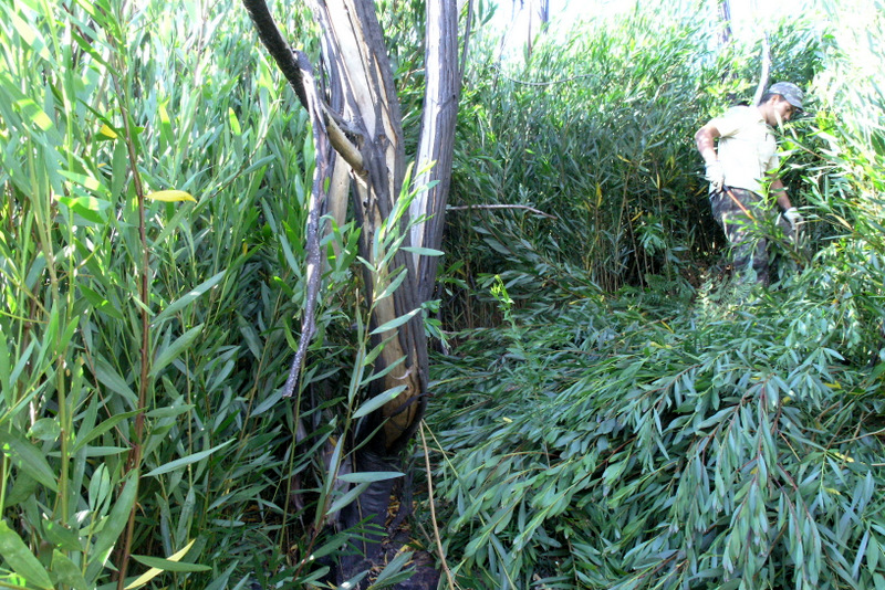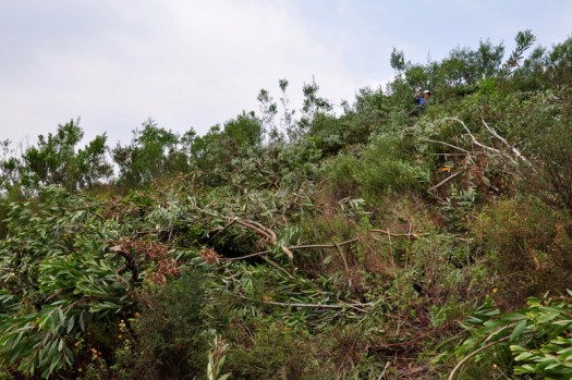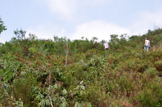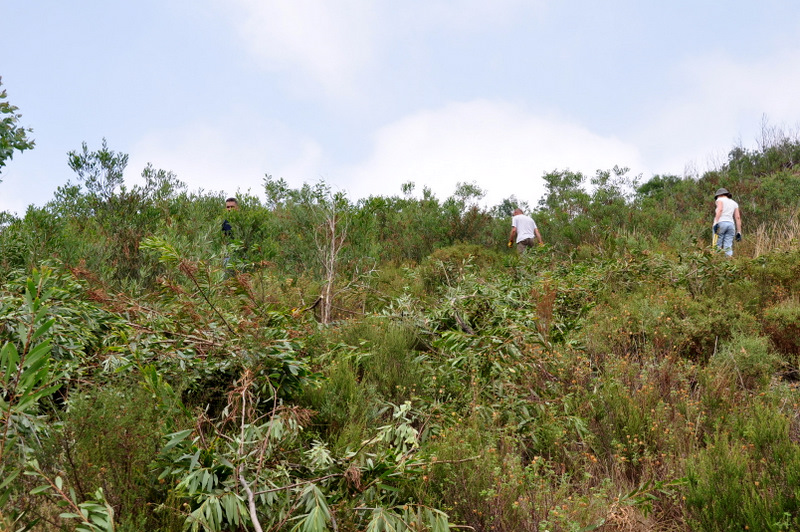 De facto, aproveitando a frescura do dia e o número de voluntários, foi proposto ao grupo o “ataque” a uma das manchas de acácia-de-espigas que nesta altura se mostrava mais preocupante. A cabeceira do vale nº 3 é, com efeito, a última área onde a distribuição desta planta ainda não se pode considerar controlada, pois que era a área onde já existia a maior, mais extensa e densa mancha de plantas desta espécie antes do incêndio de 2005, situação agravada depois do fogo. Depois de, nos primeiros campos de trabalho em 2006, praticamente não se ter conseguido intervir aqui, quando, em 2007, os primeiros trabalhos aqui foram realizados já as acácias tinham em muitos locais crescido mais de 2 metros, e com uma densidade que tornava a formação impenetrável.