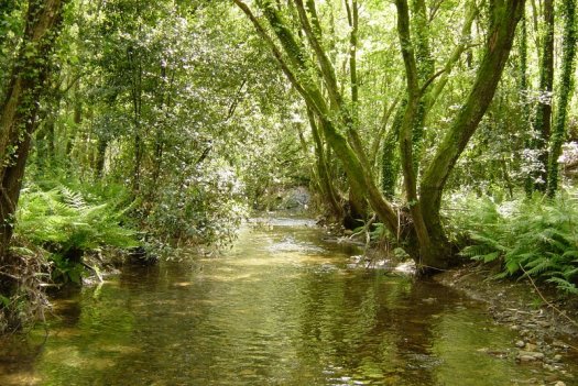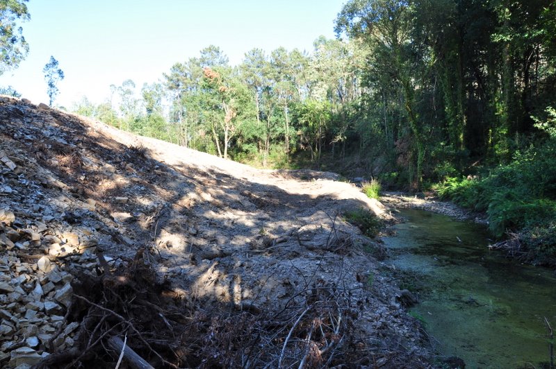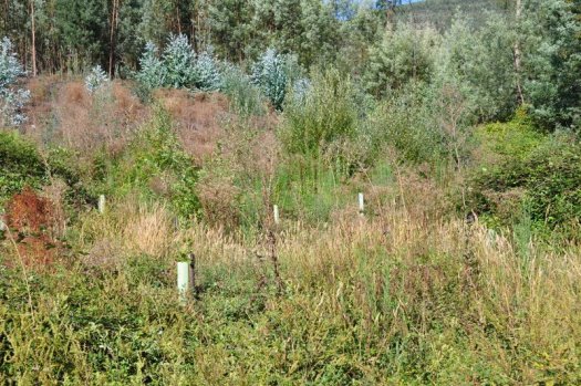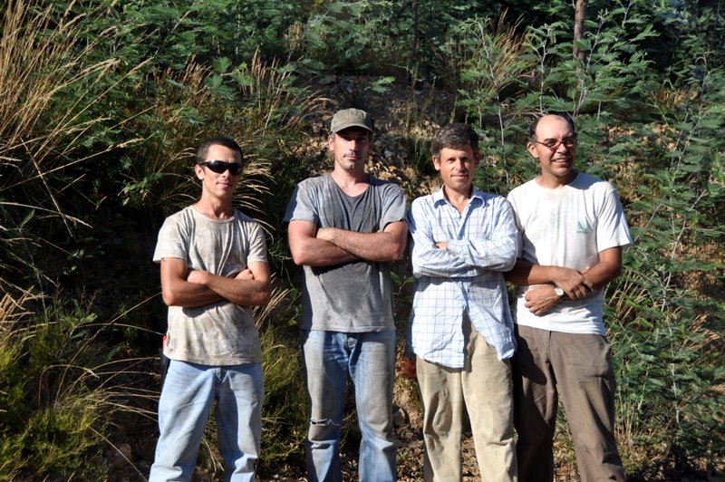 Esperava-se que desta vez a pequena motosserra de apoio aos trabalhos colaborasse, mas na realidade ela fez suar alguns voluntários até se dignar trabalhar (e apenas durante algum tempo). Coisas de máquinas… Como noutra jornada anterior, formaram-se duas equipas, um elemento de cada uma com tesourão ou motoserra e o outro com um pequeno pulverizador de mão para aplicar o herbicida. A manhã decorreu com intensidade, só com uma pequena pausa para as laranjas. A relativa monotonia do trabalho era quebrada pelo encontro com uma bela árvore plantada no ano passado ou mesmo um arbusto espontâneo já antigo, pelo relevo escarpado, com grandes afloramentos de pedra de xisto, e pela água ainda corrente ao longo dos vales 3 e 4. É realmente interessante verificar como, apesar de todas as pressões que esta terra sofreu ao longo de décadas – exploração florestal, espécies invasoras, incêndios – ainda é possível encontrar muitos medronheiros, murtas, lentiscos e adernos espontâneos, que agora finalmente voltam a ter este espaço só para eles. A madeira queimada em 2005 (5 anos depois!) ainda é um obstáculo importante à progressão no terreno. Mas a dinâmica de trabalho foi grande, aproveitando a frescura da manhã, pelo que já eram 14 horas quando, já com as T-shirts bem encharcadas, se fez a pausa para o almoço.