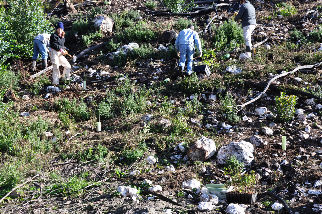 Foi num dia frio e ventoso que cinco voluntários se reuniram para dar início às Jornadas de Inverno no Cabeço Santo. Com carvalhos, medronheiros e castanheiros na bagagem, bem como com toda uma panóplia de equipamento, pouco passava das 9:30h quando a equipa se dirigiu para o terreno. Destino: o vale nº 2, onde na última jornada de Outono se tinha arrancado acácia-de-espigas. O terreno é aqui bastante declivoso e o vento soprava ainda mais forte e frio do que lá em baixo, mas como a determinação era grande, os trabalhos avançaram resolutamente.