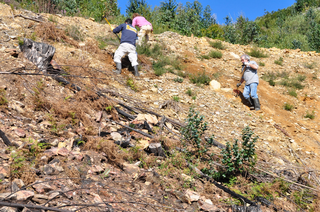 Depois das últimas plantações do dia os voluntários pegaram em tesourões e foram cortar rebentos de carvalho. Estes rebentos surgiram após a selecção de rebentos realizada no ano passado, das árvores que já existiam antes de 2005 e que rebentaram de toiça após o fogo. O corte destes pequenos rebentos, com um ano de idade, ajudará a dar mais força aos rebentos seleccionados. Deste modo, estas árvores crescem rapidamente, bem mais rapidamente do que as plantadas, visto já terem um sistema radicular desenvolvido.