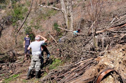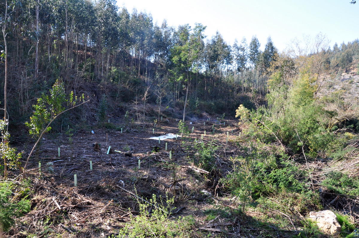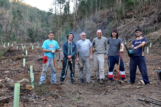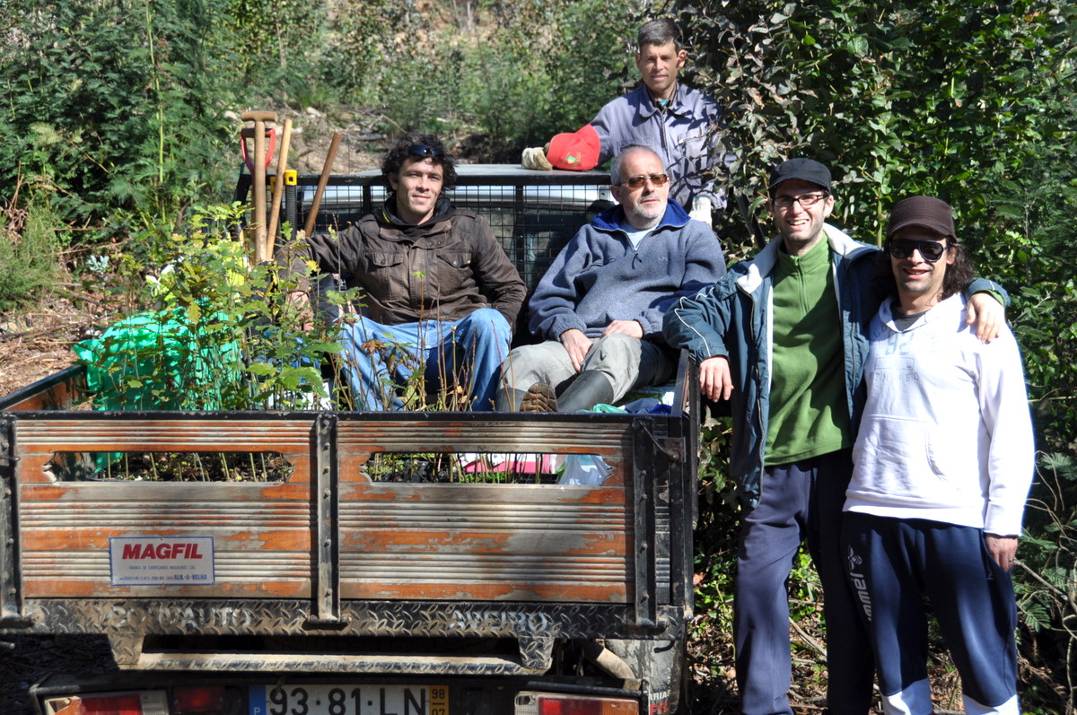No último Sábado do Inverno, já com a Primavera a anunciar a sua chegada com temperaturas elevadas e um sol radioso, seis voluntários reuniram-se para plantar as últimas árvores desta temporada. Seis? Não, cinco, já que um deles, por sinal o responsável pela coisa, ausentou-se logo à chegada com a desculpa de ter de ir tratar das abelhas. Os restantes voluntários, que não podiam escapar, dado encontrarem-se bastante longe da civilização, não tiveram outro remédio senão pôr mãos às ferramentas e plantar árvores. O local, junto ao Ribeiro de Belazaima, embora plano, encontrava-se com alguma lenha espalhada (mas nada parecido com o panorama da jornada anterior) para além de o solo ter sido bastante compactado pelo trânsito dos veículos que levaram os eucaliptos que aqui estavam, umas árvores bastante grandes que não tinham sido queimadas pelo incêndio de 2005. Estas terras eram antigas leiras agrícolas de Belazaima-a-Velha, a antiga povoação a pouco mais de 500 m, a montante. A compactação do solo exigiu por isso um esforço adicional aos voluntários na abertura das covas e preparação da “cama” para as árvores.