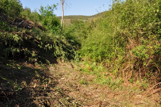 Depois foi a deslocação até ao Ribeiro de Belazaima para realizar mais algum trabalho de desimpedimento da estreita leira ribeirinha que separa as duas principais áreas adquiridas pela Quercus nesta zona conhecida por Ribeira do Tojo. Este desimpedimento, da lenha que aí ficou depositada e do silvado que se seguiu, é essencial para permitir a remoção e controlo das mimosas, e para dar espaço a uma vegetação ribeirinha que, apesar de acossada, se conseguiu fixar. Depois de um avanço de mais uns 15 ou 20 metros, mais um par de horas será o suficiente para terminar o trabalho neste local.