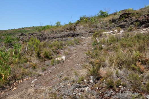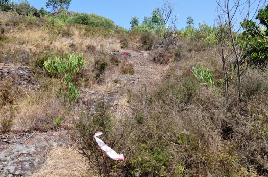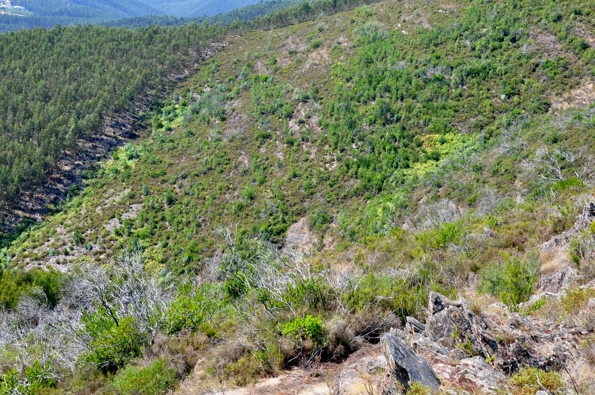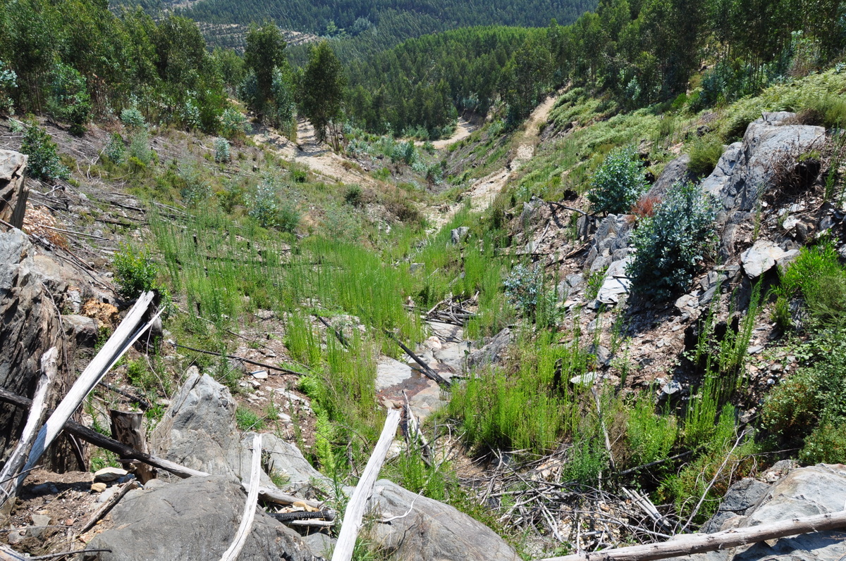 Logo ali, a cabeceira do vale nº 3, um dos locais onde a eliminação da mancha de acácia-de-espigas aí existente se revela mais complicada: tendo já sido sujeita a um corte em 2009, muitas plantas sobreviveram porque não as foi possível cortar pela base devido à lenha queimada e ao carácter pedregoso do terreno. Há que continuar, sem desistir, mas também sem esperar uma solução rápida.