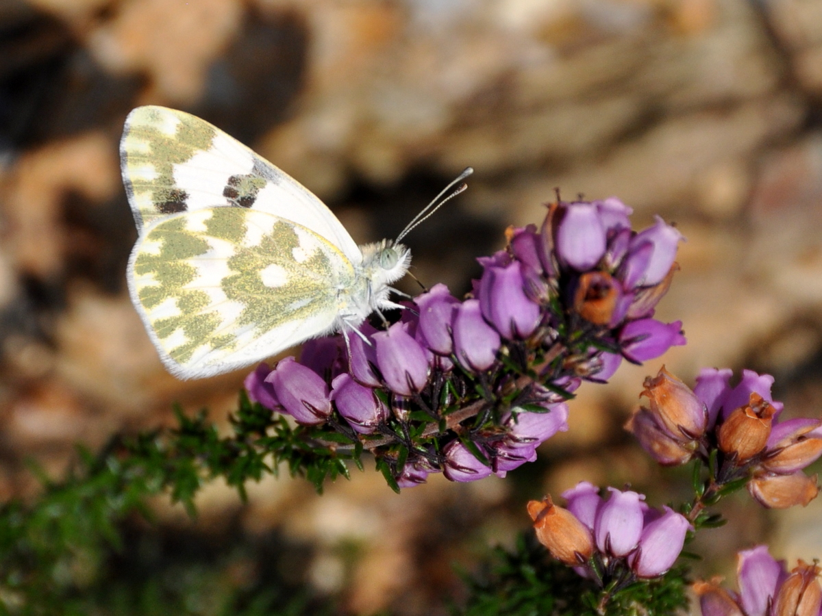 Mais à frente, uma Pontia daplidice visitava uma Erica cinerea