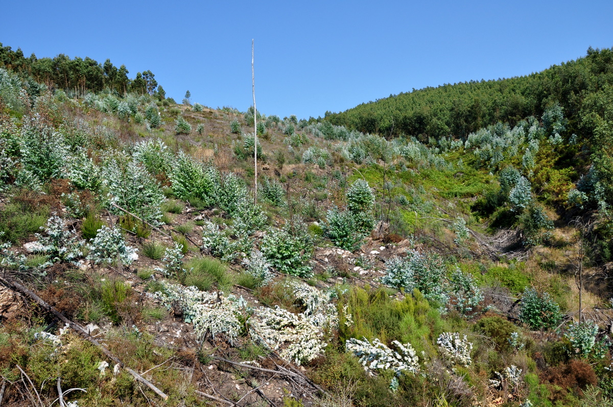Subindo um pouco, já numa encosta entre os vales 3 e 4a, o medronhal, que nunca chegou aqui a ser completamente excluído pelo eucalipto, talvez devido à pobreza do solo, também ainda não se conseguiu ver livre dele, o que neste caso se deveu a uma acção menos eficiente do herbicida utilizado para excluir os eucaliptos.