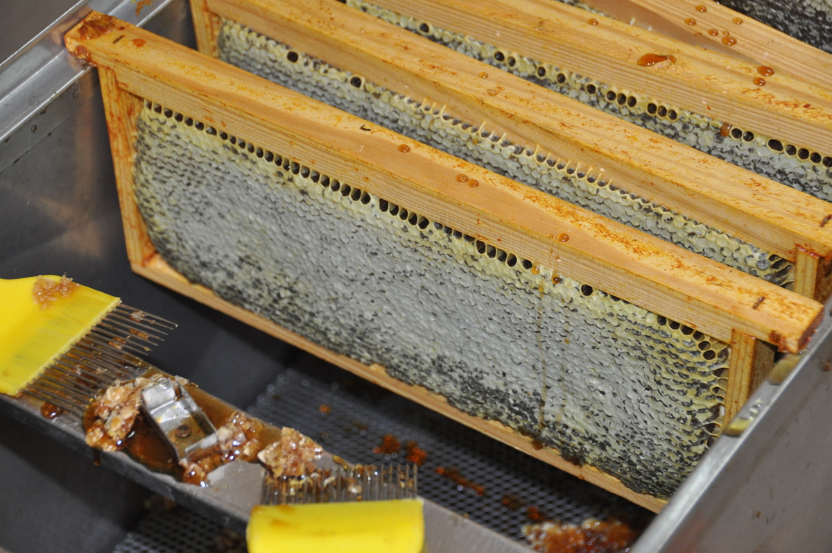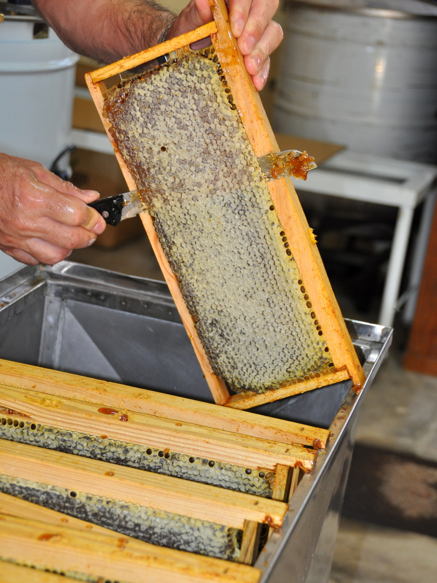 No meio deste doce Verão, que tão frescos dias nos tem trazido, aqui fica outra doce notícia, só para apreciadores: no final de Julho realizou-se a colheita de mel do apiário do Cabeço Santo, tendo resultado em cerca de 40 kg de mel de urze e medronheiro (flora dominante). Trata-se de um mel de cor escura, viscosidade elevada e sabor intenso! Algumas imagens dão conta do processo de extracção na melaria, já que no apiário não foi possível obter fotos: