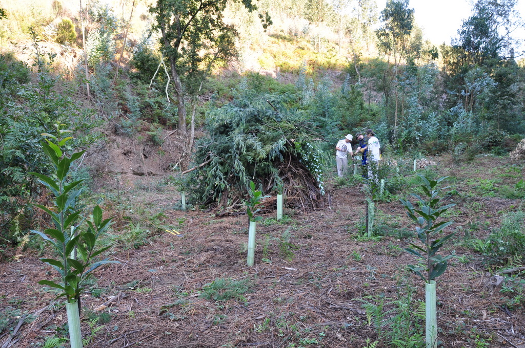 À tarde, a equipa cruzou-se (de novo) com os fantasmas de Belazaima-a-Velha, arrepiou-se com as mimosas que crescem no antigo caminho entre as Belazaimas e entregou-se ao trabalho na última área de plantação do Inverno, essa mesma onde tinha estado a equipa de há duas semanas. O desafio era remover as mimosas da margem do Ribeiro e assim iniciar a recuperação deste habitat tão mal tratado. O trabalho foi dificultado pela existência de lenha antiga nas margens, por vezes com silvado entrelaçado, mas a determinação da equipa foi grande e a verdade é que se conseguiu remover todas as mimosas de uma extensão de margem de algumas dezenas de metros. Foi interessante observar como a remoção das mimosas deu lugar à “aparição” de uma série de plantas nativas (salgueiros, loureiros, sabugueiros, carvalhos) que estavam lá, lutando desesperadamente contra “inimigos” tão poderosos, mas que não se viam porque estavam ocultadas por estes.