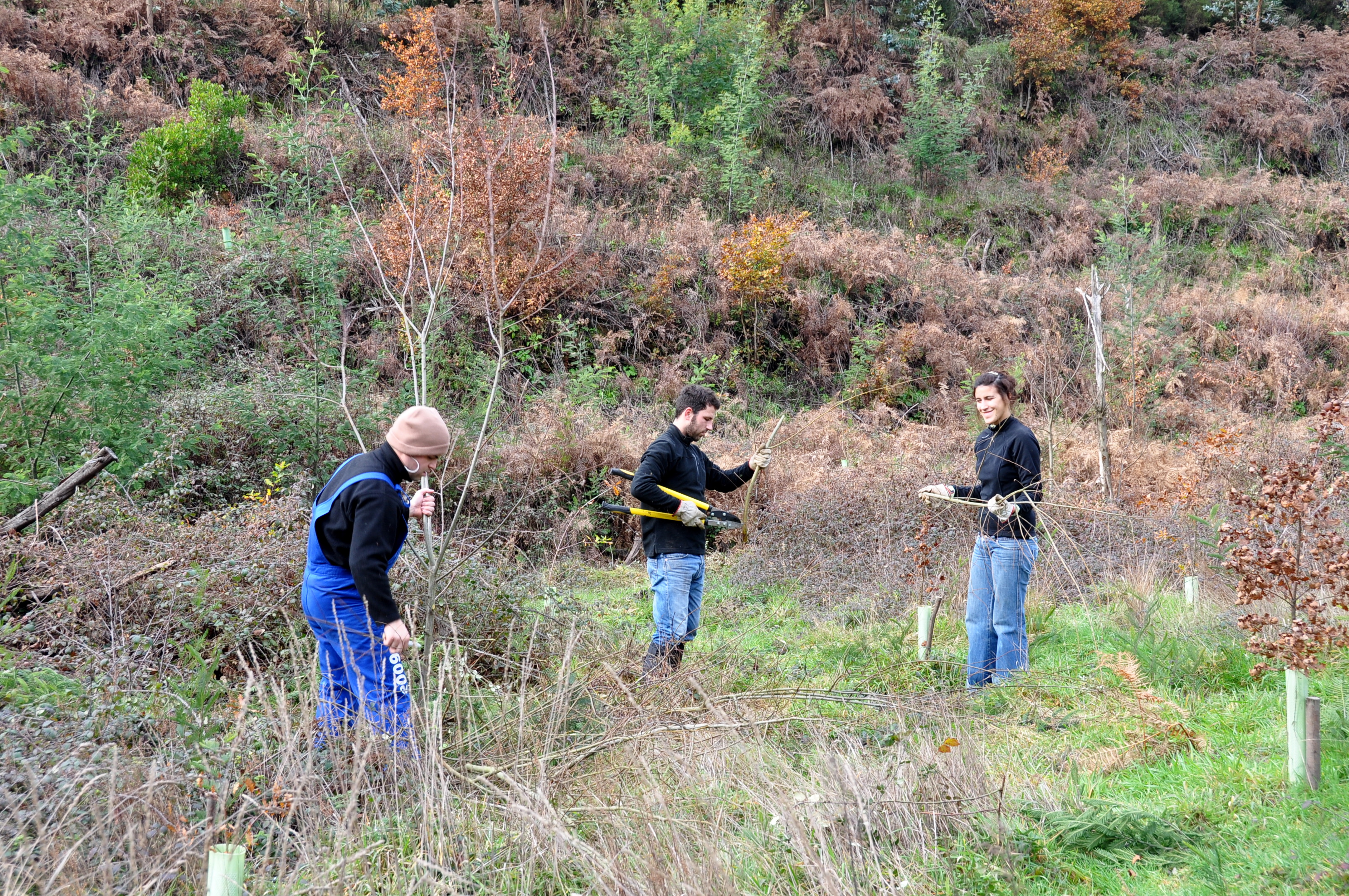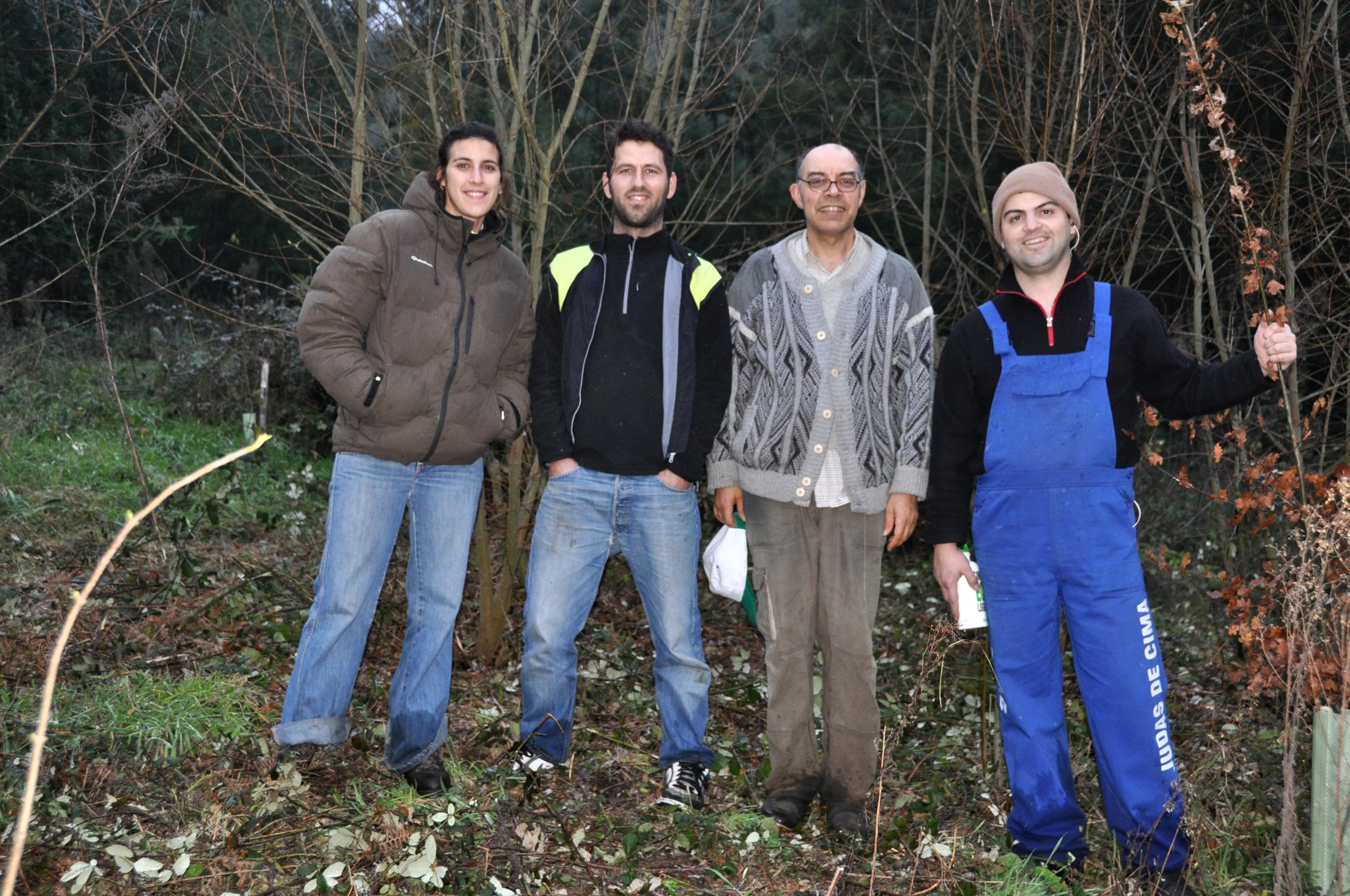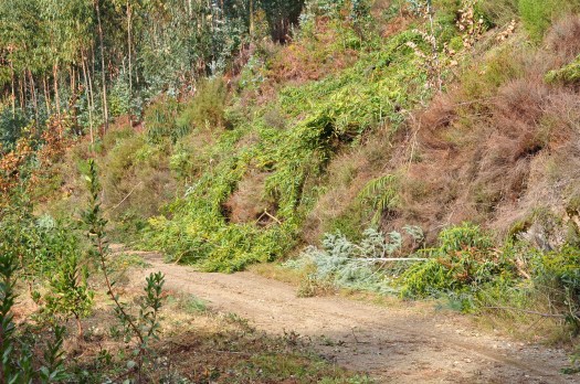 O dia estava cinzento, e embora não demasiado frio, a ausência de sol fazia-o parecer mais frio. Por isso nada melhor do que começar numa encosta voltada a sul e aquecer com o manejo dos tesourões em trabalho de corte de plantas de acácia-de-espigas. O local escolhido foi uma área junto ao vale nº 5 e ao principal caminho de acesso à mata, um local onde a mancha anteriormente existente já foi alvo de várias jornadas e pouco a pouco vai retrocedendo. Junto ao caminho, os medronheiros aí plantados em 2009 também foram libertos das silvas que os apoquentavam, e algumas mimosas que aqui crescem vertiginosamente foram também removidas.