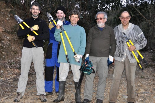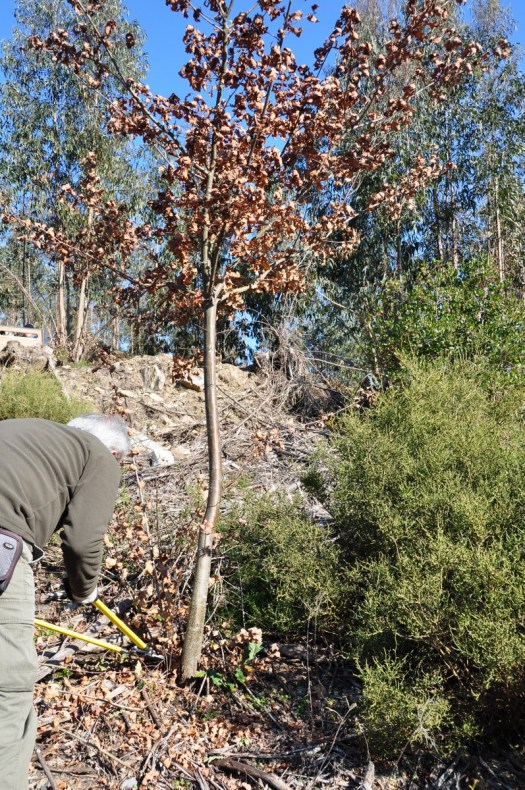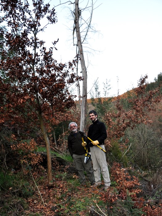 Já bem no fundo do vale do Ribeiro, equipa encontrou um local abrigado e ensolarado para o almoço. Depois deste, o trabalho programado: cortar rebentos secundários dos carvalhos. Estes carvalhos já existiam aqui antes do fogo de 2005, embora tivessem a agressiva competição dos eucaliptos e das mimosas; muitas vezes não ultrapassavam o porte de pequenos arbustos. Depois do fogo rebentaram abundantemente de toiça, beneficiaram da remoção de eucliptos e mimosas e, em 2009, foi feita uma primeira selecção dos rebentos que irão reconstituir as árvores. Foram deixados entre um e três, excepcionalmente quatro rebentos por toiça. Mas a jovem árvore continuou a rebentar pela base nos anos seguintes, pelo que é necessário agora cortar esses rebentos, que tiram força aos rebentos principais. Paralelamente, faz-se uma segunda selecção de rebentos principais, deixando entre um e dois. Foi esse o trabalho que foi realizado o resto da tarde nos carvalhos das largas faixas de margem ao longo de mais de trezentos metros do curso do Ribeiro.
