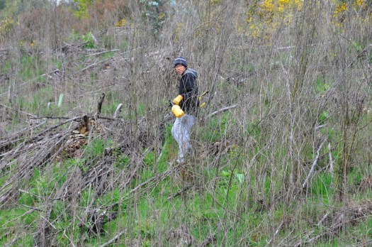 Voluntário em busca de mimosas entre a rebentação seca do que já foi uma formação muito densa