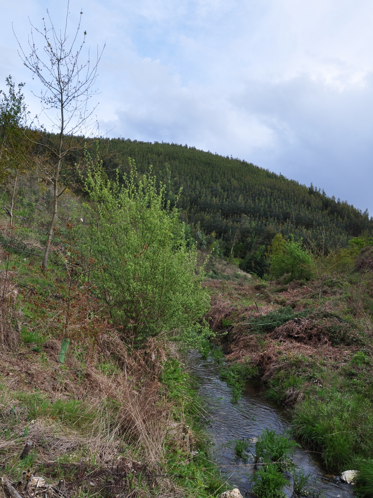 Foi interessante verificar como junto ao ribeiro os carvalhos estão muito mais atrasados na sua rebentação do que no alto do monte, e até mesmo umas dezenas de metros acima na encosta. A vegetação concorrente, sobretudo o silvado, foi removida com uma motoroçadora. Quanto às mimosas, foi ensaiada, numa escala ainda não aplicada no Cabeço Santo, a técnica do descasque do tronco. A ferramenta usada foi a navalha, que funcionou bastante bem, embora também tenha trazido alguns dissabores. No entanto também se usaram outras técnicas, consoante as características de cada formação: em manchas densas (já poucas, felizmente) cortou-se com motosserra para posterior pulverização da rebentação com herbicida; em plantas isoladas não muito grossas, aplicou-se herbicida na superfície de corte; em áreas planas, nas quais é necessário limpar com frequência com a motoroçadora, simplesmente cortou-se (a rebentação é depois apanhada com frequência pela motoroçadora) e finalmente nas áreas mais sensíveis (margens do ribeiro e zonas de difícil acesso) usou-se a técnica do descasque do tronco.