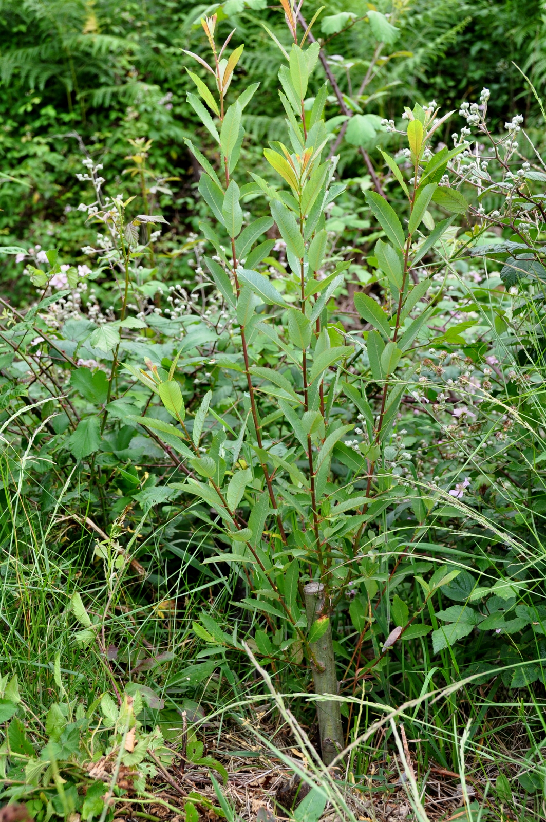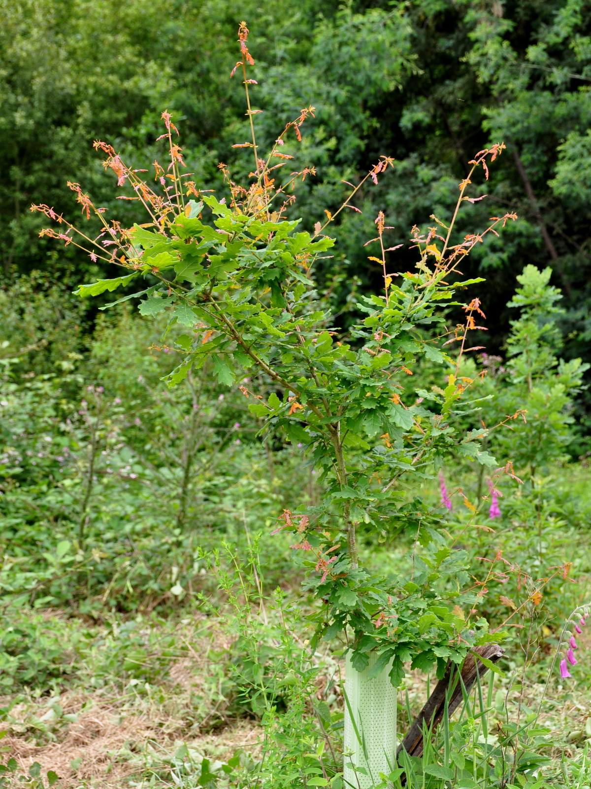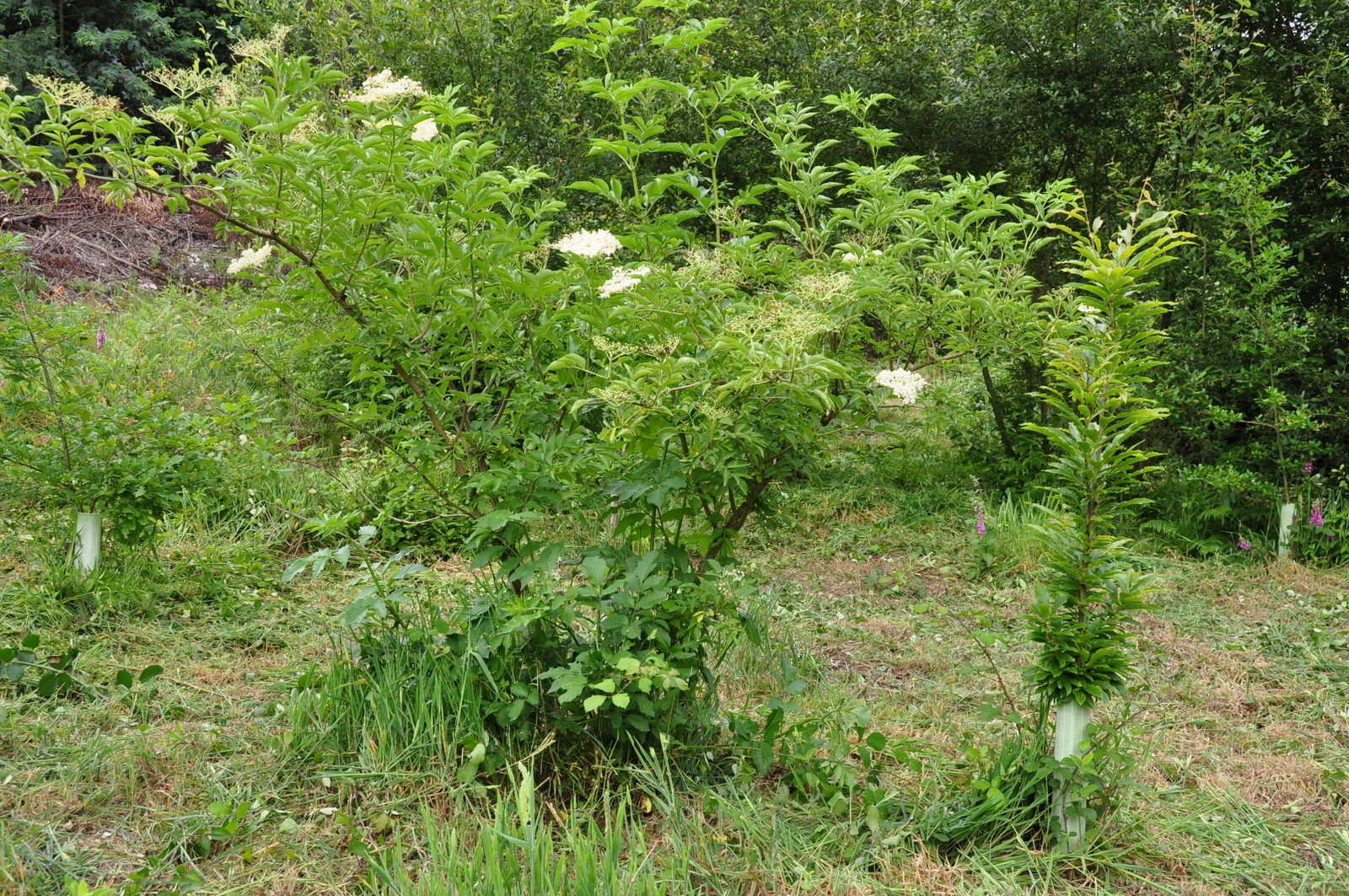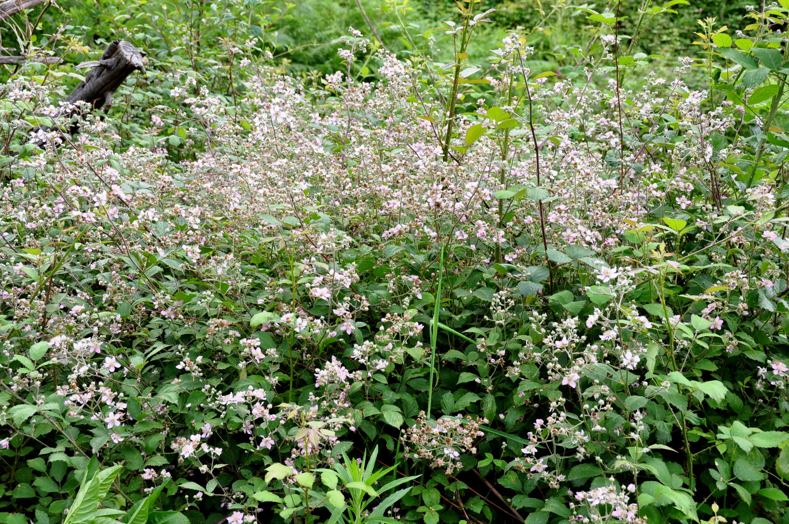 Mas, já na Ribeira do Tojo, verificava-se que o silvado, apesar de ser cortado com frequência (este ano já o foi uma vez) já precisava de o ser ainda outra! As árvores aqui plantadas em 2010 encontram-se em geral com muito bom aspecto, a prenunciar um bonito bosque de folhosas daqui por 20 ou 30 anos! Mas entretanto, não apenas o silvado mas a vegetação mais directamente concorrente com as árvores, necessita de ser cortada para lhes dar as melhores condições de crescimento. Aqui, apesar de tudo, o silvado tem o seu lugar. Concretamente a cobrir aqueles montes de lenha de mimosa que aqui foi acumulada em 2010, e que agora se encontram totalmente ocultados pelo silvado. E como ainda quase não há ensombramento, este silvado floresce com extrema abundância atraindo imensas abelhas, quase parecendo que nos encontramos no meio de um colmeal!