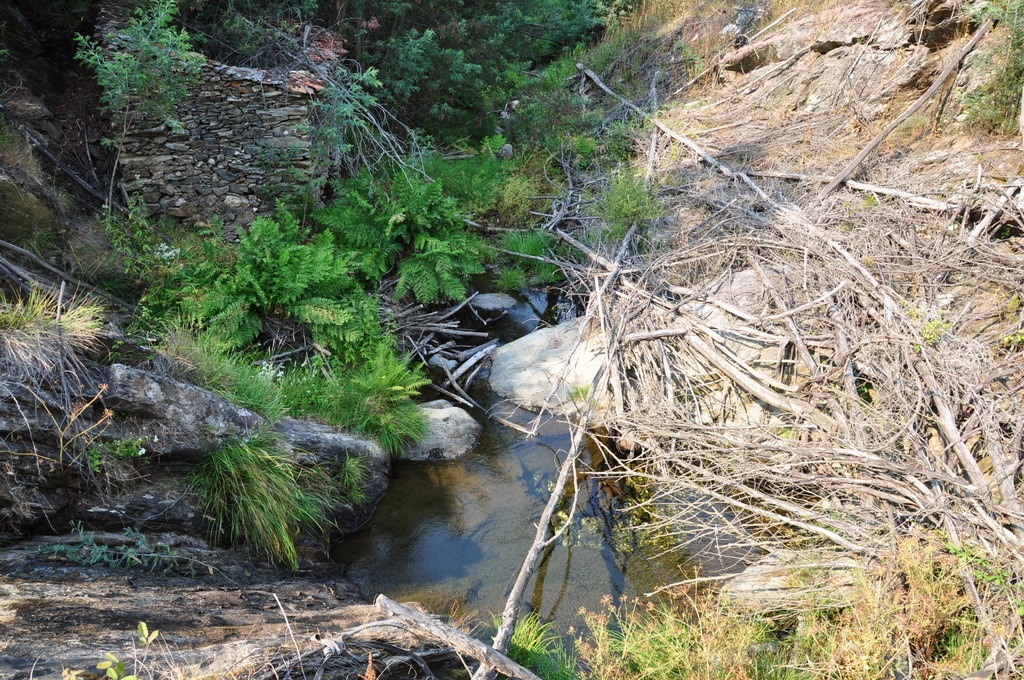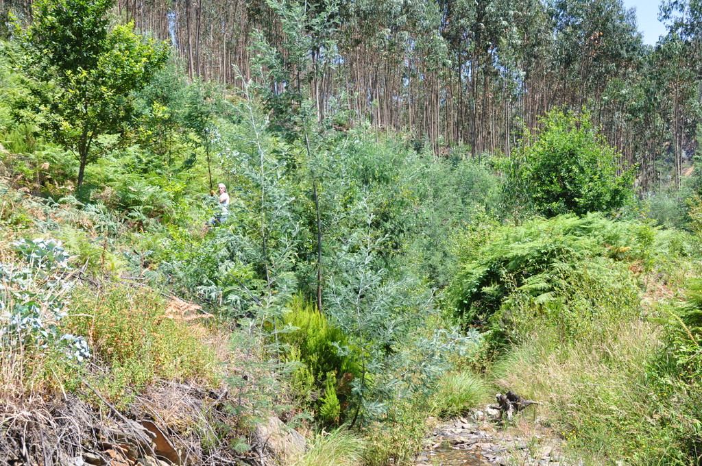 Toda a área neste dia trabalhada já tinha sido alvo de uma jornada de trabalhos de acompanhamento, para além, claro, dos trabalhos iniciais de corte e pulverização extensiva das mimosas. Mas mesmo assim as mimosas presentes ainda eram muitas, como se pode constatar pelas imagens, demonstrando a persistência que este trabalho exige. E eram muitas, particularmente na zona mais difícil, nas próprias margens do ribeiro, onde o declive e a lenha depositada ainda presente mais dificulta as intervenções. Mas a equipa deste dia tirou partido de o caudal do ribeiro ser pequeno nesta altura do ano, para intervir de forma o mais eficaz possível usando tanto a técnica do descasque como a do corte com tesourão ou moto-podadora seguido de aplicação de herbicida na superfície de corte.