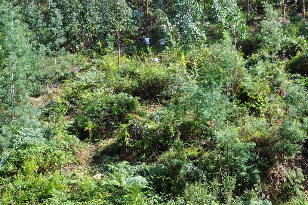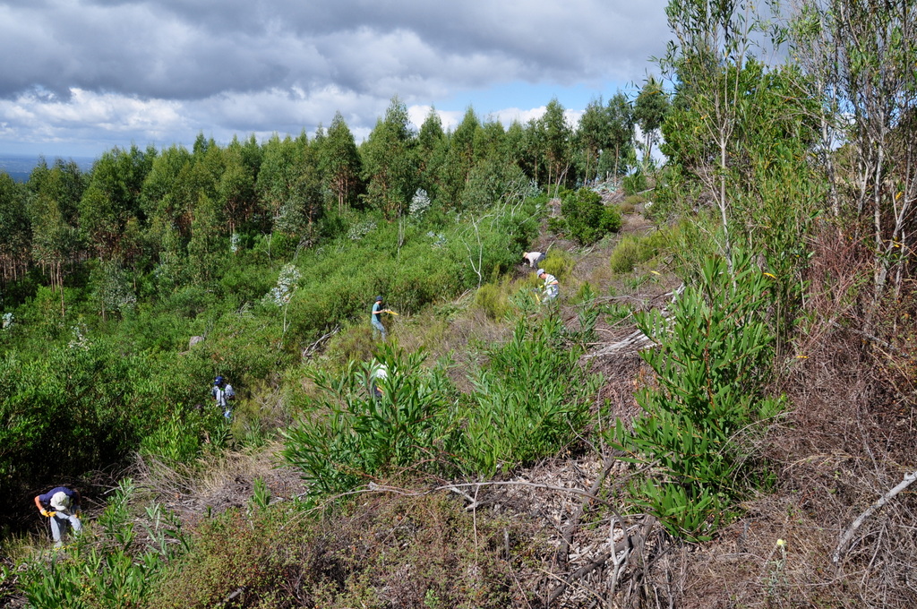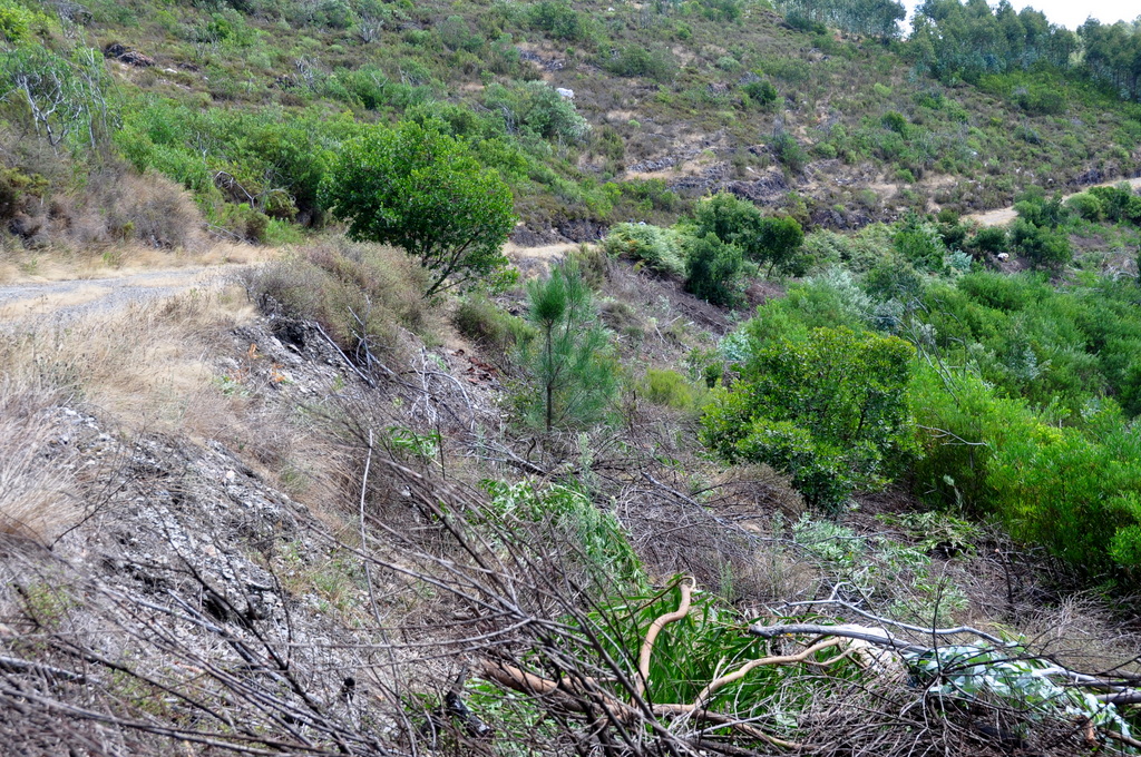 Logo pela manhã rumou-se à cabeceira do vale nº 3, onde anteriormente ao incêndio de 2005 existia a mais densa e desenvolvida mancha de Acacia longifolia de toda a área de intervenção do projecto. Depois do fogo, claro, ainda mais densa ficou, e não tendo sido possível fazer aí grandes trabalhos de arranque enquanto a dimensão das plantas o permitia, só em 2007 se começaram a abrir umas galerias de acesso através de uma densa mancha com plantas de mais de 2 metros de altura. Mas nesse momento a mão-de-obra era ainda escassa e só em 2009 uma equipa de sapadores florestais cortou pela primeira vez toda a mancha, de cerca de 1 ha. Só que, a lenha queimada ainda acumulada e as dificuldades do terreno (declivoso, rochoso) não permitiram cortar as plantas bem pela base, como seria desejável. Resultado: parte significativa das toiças rebentaram e a mancha começou a reconstituir-se. Já no Inverno deste ano decidiu-se avançar para novo corte, mas limitado a uma faixa de cerca de 20 m de largura. A equipa de sapadores da AFBV procurou agora fazer um corte o mais baixo possível de todas as plantas, ainda que com progressão mais lenta. Mesmo assim, algumas plantas ainda rebentaram e a intervenção voluntária deste dia tinha como objectivo cortar estas plantas e finalmente aproximar-se da eliminação total das acácias nesta faixa. Mais uma vez, as dificuldades maiores residiam no facto de haver muita lenha espalhada pelo terreno, obrigando por vezes a mudá-la de sítio para se conseguir chegar ao ponto de rebentação das plantas. Por outro lado, é reconfortante verificar que, aqui e ali despontam já plantas nativas, desde as mais vulgares urzes e cistácias a arbustos como o lentisco e o medronheiro. E foi com determinação que a equipa avançou durante a manhã cerca de 100 m, conseguindo fazer um excelente trabalho ao longo de quase toda a extensão da faixa. Neste difícil local, será provavelmente assim que se progredirá, lentamente, mas com confiança, ao longo dos próximos anos: uma equipa profissional faz uma faixa por ano, e as equipas voluntárias fazem o acompanhamento.