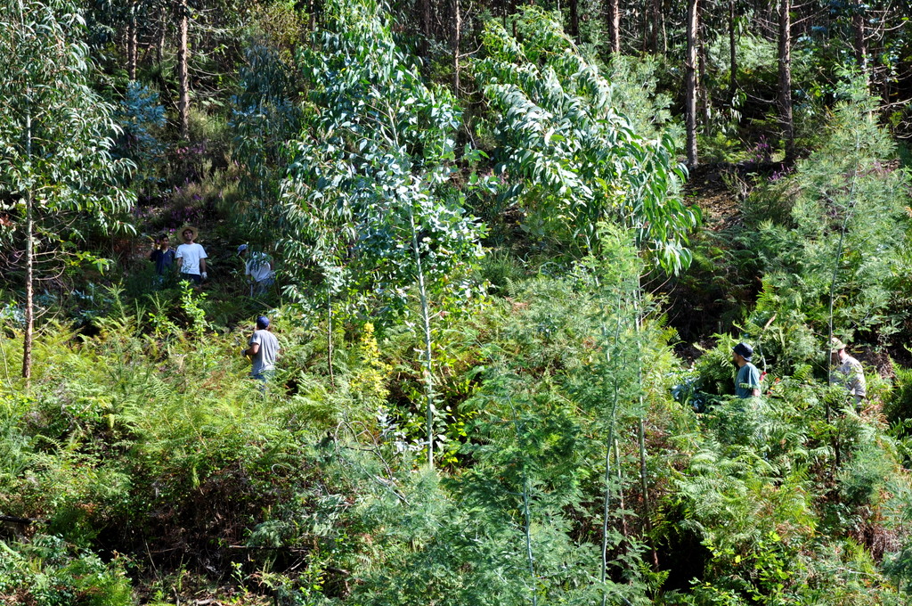 À tarde a equipa deslocou-se até outra área bem difícil: uma zona intermédia do vale nº 5, onde as mimosas e até alguns eucaliptos continuam a desafiar, mais uma vez, a nossa paciência e persistência. Ainda um vale sobrecarregado de lenha agora já semi-podre por onde as mimosas crescem sem às vezes se conseguir vislumbrar de onde brotam. Mas aqui um solo fértil, onde o silvado também cresce com força, dificultando a penetração no terreno. Mas lá se foi evoluindo e redescobrindo os carvalhos aqui plantados em 2010, para deixar a encosta sobranceira ao vale com um aspecto bem diferente do inicial. Logo a jusante do caminho principal de acesso à mata outra mancha de mimosas ainda mais vigorosa lançava a sua sombra. Mas essa já necessitará de outro tipo de abordagem.