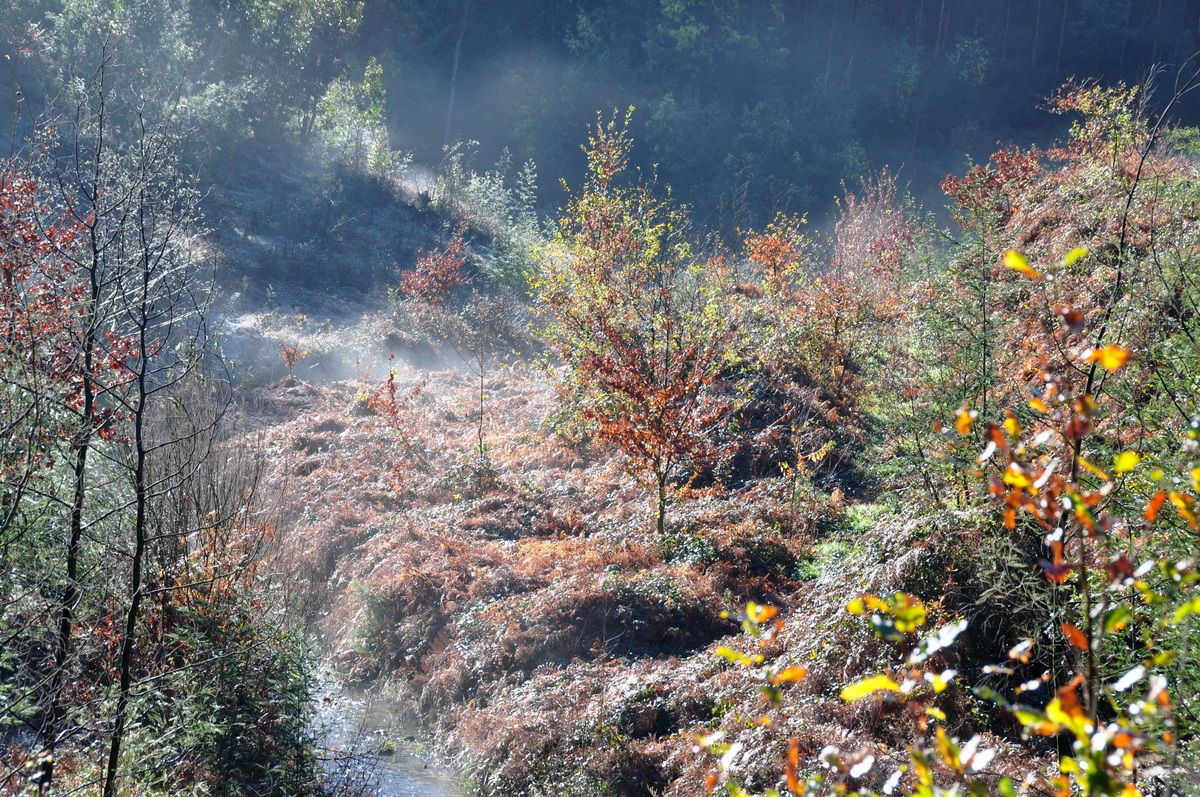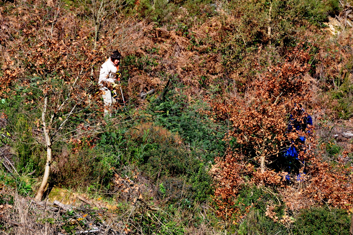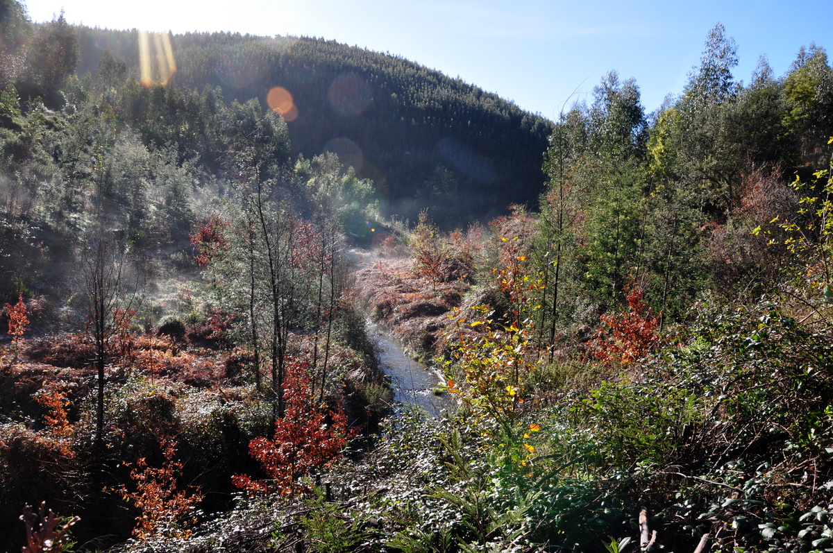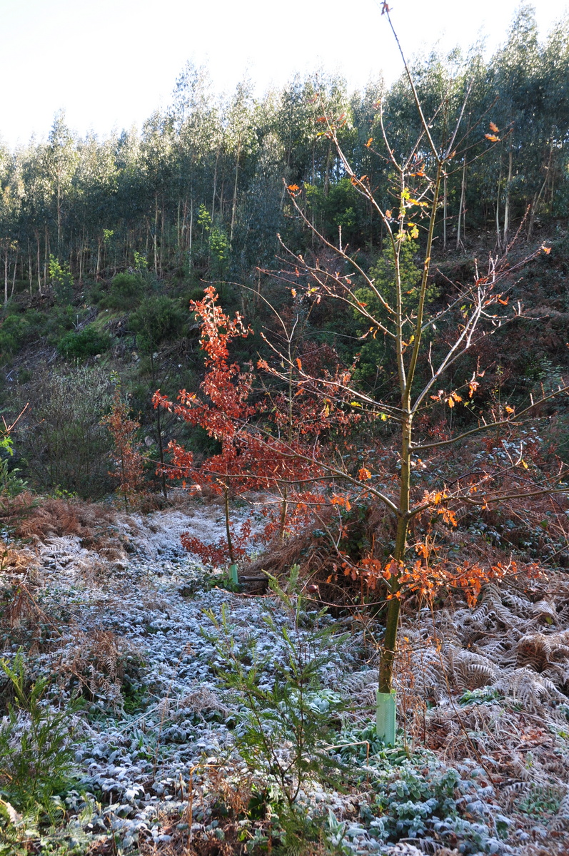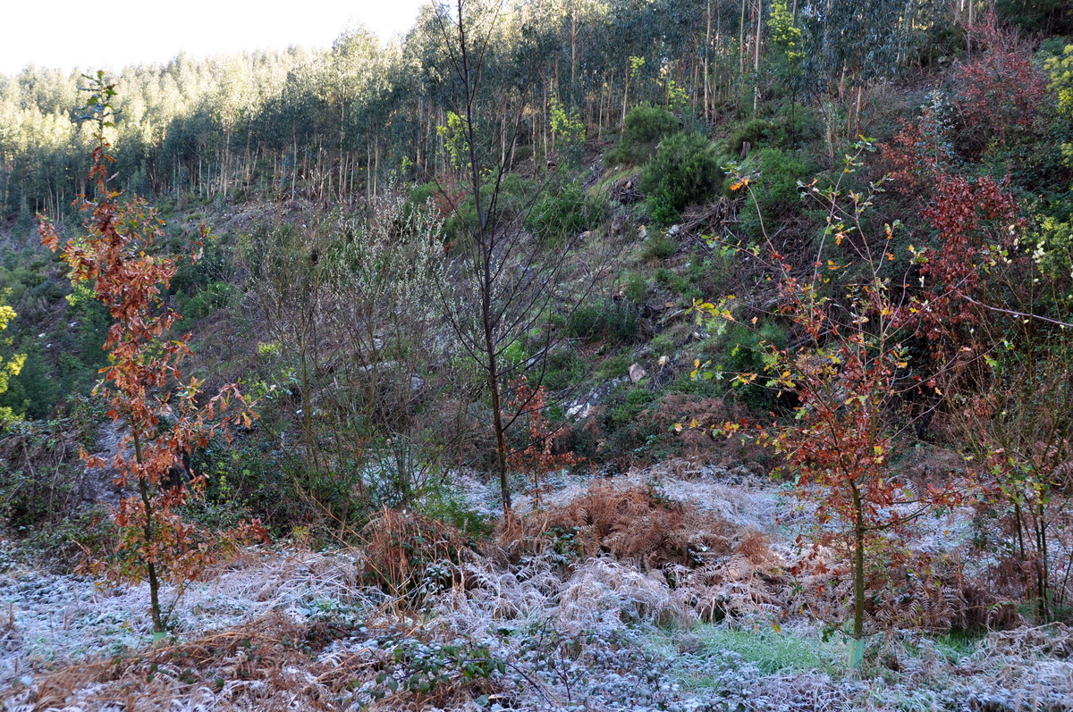 Quando a equipa chegou, o branco da geada cobria as terras do vale do ribeiro onde o sol ainda não tinha chegado, mas ao mesmo tempo os primeiros raios da manhã criavam uma neblina que dava ao vale um ar “misterioso”. Os trabalhos a realizar consistiam em cortar a rebentação secundária, sobretudo das árvores originárias de rebentação de toiças, efectuar alguma desramação, desbastar rebentos ou árvores demasiado próximas umas das outras, e cortar vegetação concorrente, sobretudo silvado, mas este não tão prioritário como os outros trabalhos.