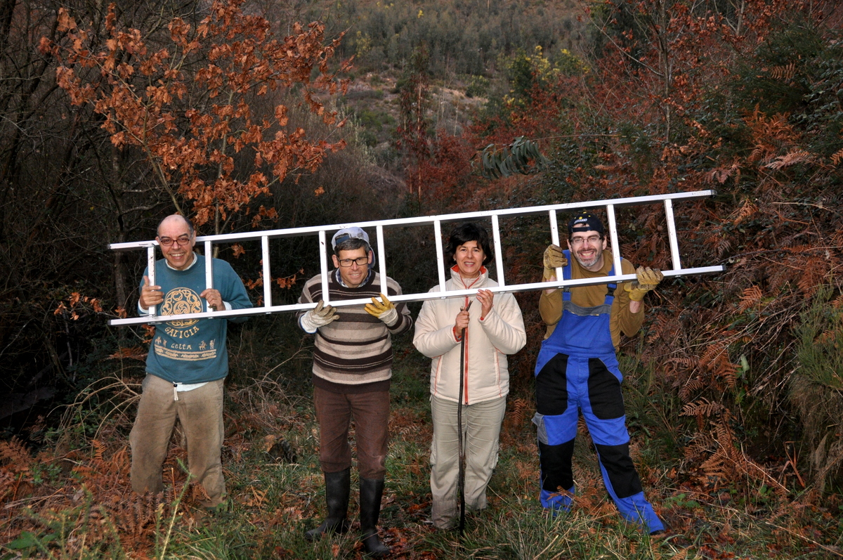 E foi assim, entre os carvalhos de rebentação de toiça, já com 7 anos de crescimento desde 2005 e os últimos carvalhos plantados, sobretudo nos anos de 2009 e 2010, que se passou uma intensa jornada de trabalho voluntário que só terminou porque começou a escurecer, pois vontade de continuar não faltava. Aliás, não se pôde concluir este trabalho essencial, pelo que, em princípio, a jornada de 9 de Março ainda lhe será dedicada. A foto de encerramento teve como “enquadramento” a escada que serviu de ponte improvisada para atravessar o ribeiro, que agora levava bastante água.