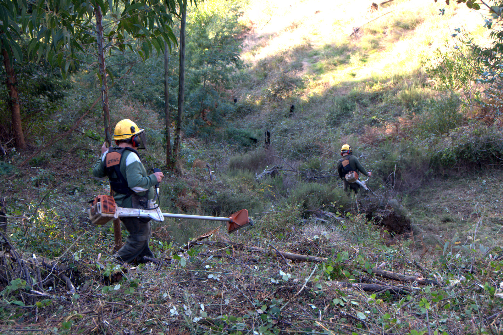 Depois do almoço a equipa abandonou este local para se deslocar até à cabeceira do vale nº 5, onde uma nova área tinha sido preparada uns dias antes por uma equipa da Associação Florestal do Baixo Vouga para receber a plantação. Este trabalho consistiu na trituração do matagal e no corte das mimosas ainda presentes. O local já tinha sido alvo de uma sementeira de bolotas há dois anos, mas essa sementeira não foi muito bem sucedida, apesar de uma dúzia de carvalhos de origem seminal se poderem encontrar aqui. O solo é bastante fértil numa das vertentes do vale e muito pedregoso na outra, encontrando-se aí até uma área de vegetação espontânea sem indícios de exploração florestal. No entanto as mimosas, que no passado cobriam intensamente o vale, ainda vão permanecendo onde são menos molestadas. Esta foto de 2003, mostra como era esta zona do vale antes do incêndio de 2005: