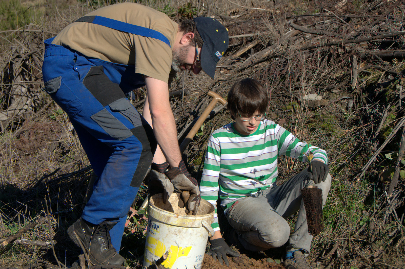 A jornada voluntária de 7 de Dezembro foi a segunda desta época devotada à plantação de árvores e retomou o ponto onde os trabalhos tinham ficado duas semanas antes. Mas esta não iria ser uma jornada fácil: quando a equipa de cinco voluntários chegou ao terreno o sol ainda não tinha chegado ao vale e um intenso manto branco revestia a paisagem. Não era um convite para ficar parado, não obstante a beleza do cenário. Mas logo se verificou, ou melhor, já se sabia, que este não iria ser um terreno fácil: pouco solo, muitas pedras, e sobretudo imensas raízes de mimosa, das mais grossas às mais finas, estas em particular formando quase um “tecido”, aglutinando as partículas de solo e criando uma crosta compacta à superfície que até a água tem dificuldade em penetrar. Estas crostas têm que se desfazer com as mãos, para que se possa desagregar o “tecido” de raízes e para que o respectivo solo se possa misturar com composto e fazer uma boa “cama” para a árvore a plantar. Neste tipo de terreno privilegiou-se a plantação de medronheiros e, quando as condições melhoravam um pouco, sobreiros. Só mais abaixo, já perto das antigas terras agrícolas do vale, se plantou um ou outro carvalho.