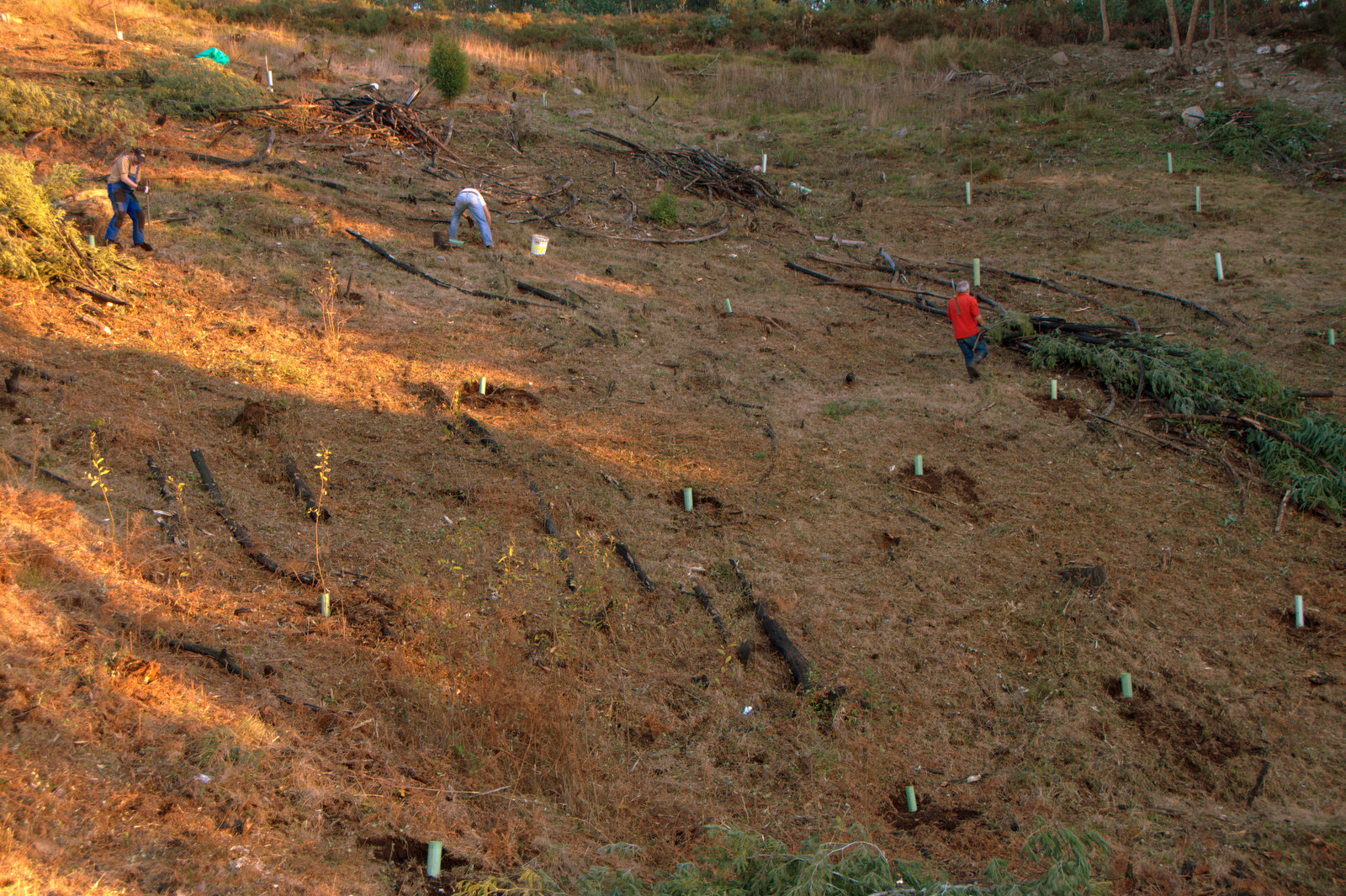 Seis meses mais tarde, já no Outono, fez-se a referida sementeira e agora, finalmente, a plantação! Mesmo depois de todos os trabalhos passados ainda foi necessário juntar troncos que a queimada não tinha eliminado completamente, para facilitar os trabalhos presentes e sobretudo os futuros. Neste local, a dificuldade maior era o declive do terreno, com a consequente necessidade de transportar ferramentas, plantas e fertilizantes, encosta abaixo. Bem, se fosse encosta acima, era pior…