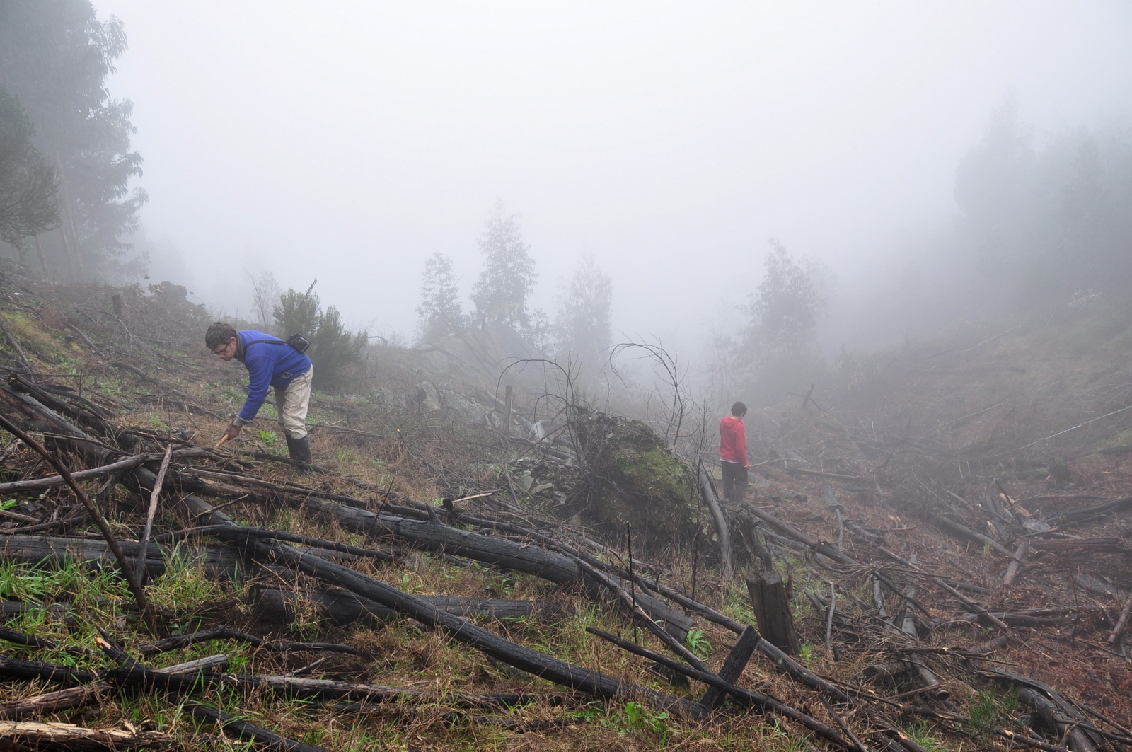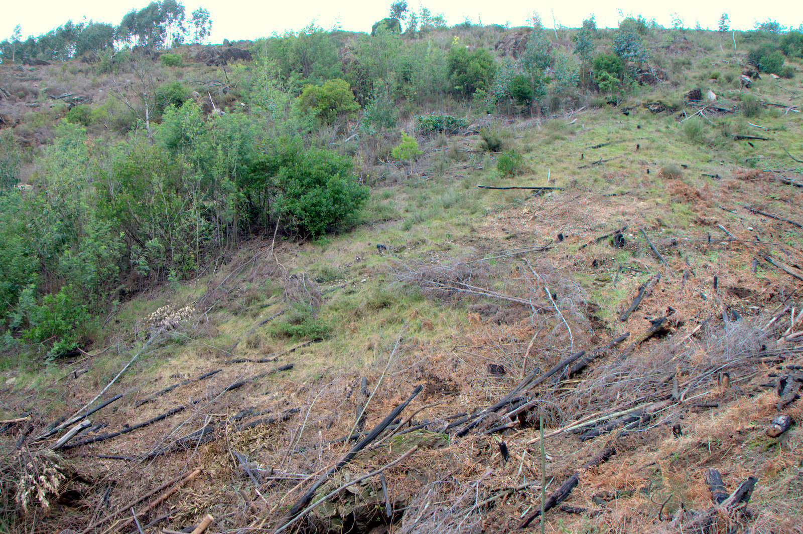 O destino era o vale nº 5, para continuar os trabalhos da jornada anterior. Mas, já na Mata do Cabeço Santo, um segundo motivo a querer roubar o alento aos voluntários (o primeiro era o chuvisco!): encontrou-se na beira do caminho um medronheiro, daqueles que foram plantados em 2010, e agora já com 2 metros de altura, cortado a golpes de machado há muito poucos dias. Fez-se o que havia a fazer: um corte a serrote da toiça e esperar que rebente de novo.
