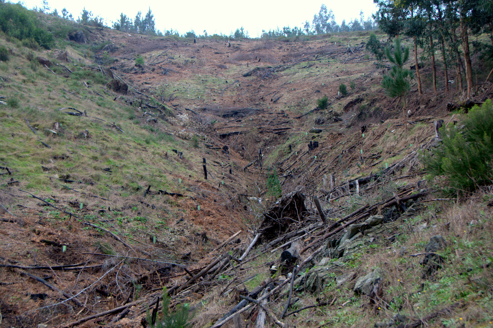 Logo ali, deixou-se o antigo caminho da mata e subiu-se por um caminho mais recente, aberto pela Altri florestal já depois de 2005. Mas 200 metros à frente, novo contratempo: a água das abundantes chuvas que têm caído, havia aberto uma tal cratera no caminho que era perigoso continuar por ali. Teve que ser recuar até ao caminho principal! Mas, seguindo agora por este outra vez, novo motivo de desalento: já ao chegar ao vale nº 5 havia ali um carvalho de dois troncos já anterior a 2005. Com o fogo, ficou muito danificado, mas ao longo destes anos tinha vindo a recuperar. Agora constatámos que o tronco mais grosso tinha sido cortado, tendo ficado apenas o mais fino. Por certo um abuso seguramente alheio à Altri florestal.
