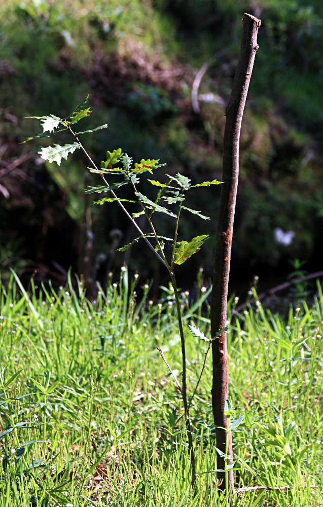Parte da leira já tinha carvalhos que, embora com danos, mantiveram a parte aérea após o incêndio de 2005. Após anos de lenta recuperação, estes carvalhos estão agora bonitos e também eles foram cuidados, cortando-se rebentos secundários e fazendo algum desbaste de árvores decrépitas. Também aqui a equipa de “arrumação” trabalhou diligentemente para deixar este local um “brinquinho”, onde vale a pena voltar com frequência. Na outra margem do ribeiro são ainda as mimosas que dominam, mas felizmente também será possível intervir aí.
