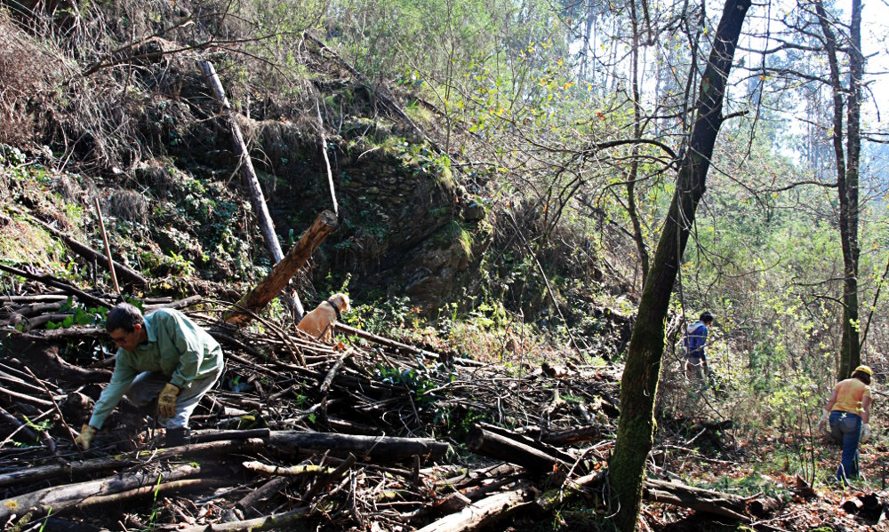 Enquanto um grupo de voluntários ia plantando azevinhos neste espaço, outro grupo foi limpar uma área mais a montante para também se poder plantar. Esta área era uma antiga leira agrícola, muito estreita, mesmo junto ao curso do ribeiro, e por onde só se tinha acesso por um carreiro de pé-posto. Esse carreiro esteve obstruído muitos anos, pelo menos desde 2005, quando um “dilúvio” de lenha queimada se abateu sobre a encosta. No entanto, desde o ano passado, foi sendo desobstruído e finalmente agora podia dar acesso à leira. Também esta esteve todo este tempo obstruída com imensa lenha, mas como alguma foi apodrecendo, agora já não dava um trabalho excessivo limpá-la para finalmente plantar. De facto, o trabalho de a limpar foi muito maior do que o de a plantar, pois que, para além de lenha espalhada, ainda havia o silvado e… o lixo. Encontraram-se bidóns metálicos, um recipiente de pintura, e mesmo uma bateria de chumbo! Como é que tudo aquilo foi parar a uma leira inacessível? Simples: entre a leira e o caminho mais próximo encontra-se uma encosta muito inclinada, e parece que encostas inclinadas são os sítios preferidos para depositar lixo. Deve dar a ideia que “desaparece”, porque não fica onde foi depositado.