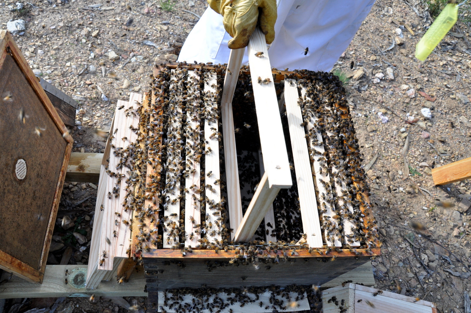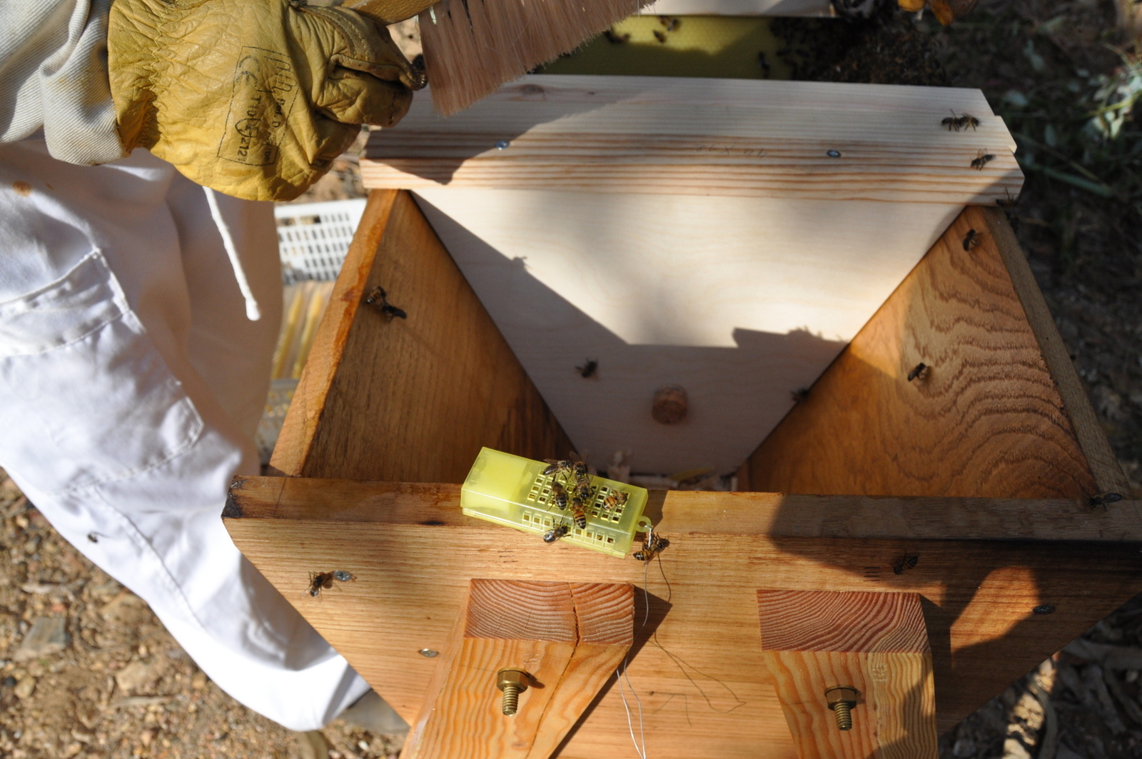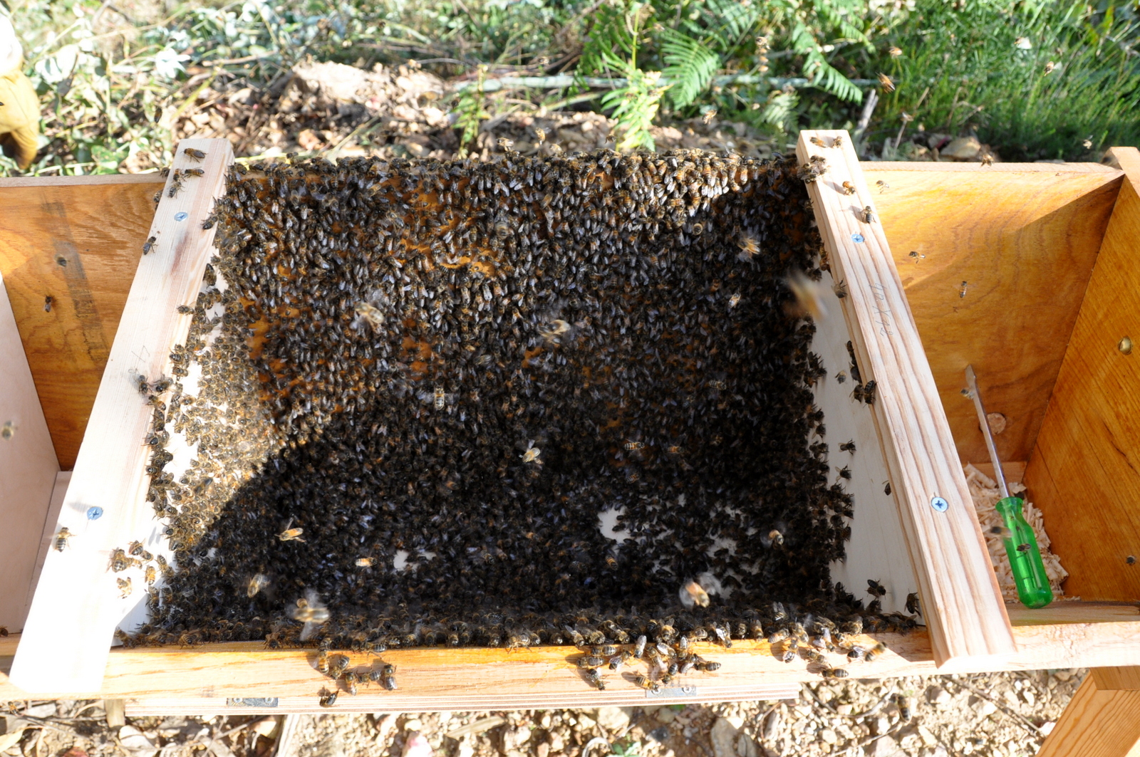 Os enxames para povoar estas colmeias vieram dos Açores (http://apizores.blogspot.pt/) em caixas sem qualquer quadro ou favo, a situação mais favorável quando se pretende instalar colmeias em modo de produção biológico sem que existam fornecedores de núcleos (enxames em pequenos ninhos) criados desse modo. Mesmo que existissem, a transição para uma colmeia como a hTBH seria sempre mais complicada.