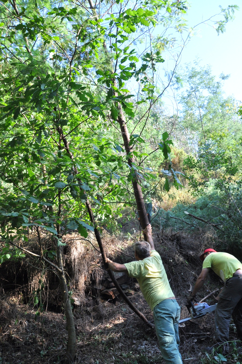 Na segunda semana de Julho uma equipa da Associação Florestal do Baixo Vouga trabalhou na remoção de uma mancha de mimosas na zona da Ribeira do Tojo, um pouco a montante de um dos grandes vales que desce do Cabeço do Meio até ao Ribeiro. Esta é uma das duas manchas densas que conseguiu recuperar depois da primeira intervenção há 5 anos. Para isso contribuiu o facto de na altura haver uma massa considerável de troncos de mimosas queimadas no chão, o que dificultou as operações de controlo posterior. Mas agora já se decompuseram em boa medida, pelo que pareceu ser um bom momento para re-intervir. Desta vez optou-se, dada a possibilidade de o fazer, por triturar toda a ramada e troncos de pequeno diâmetro num triturador acoplado a um tractor. Desta forma não ficam a estorvar no terreno e dão origem a um produto (a ramada triturada) que pode ser utilizado para melhorar o solo. Claro, como tudo, é uma opção com custos (mão de obra, gasóleo, máquina), e só se pode por em prática onde vai um tractor, o que não é sempre o caso no Cabeço Santo.