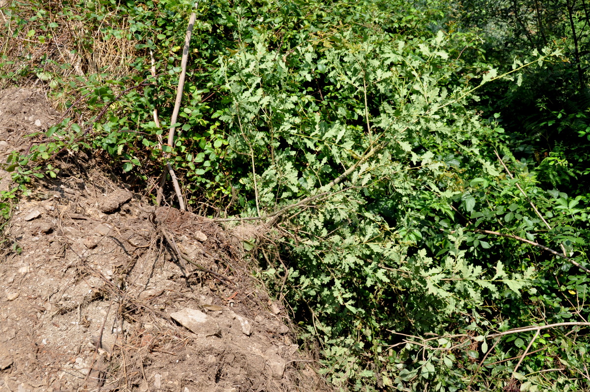 Um dia deste final de Julho fui à área de intervenção ribeirinha a montante do pé-torto, pelo antigo caminho de acesso a Belazaima-a-Velha. A Junta de Freguesia tinha, nos dias anteriores, mandado executar trabalhos de melhoramento do caminho, o que com efeito o tornou mais transitável, após os estragos do último Inverno. Mas não parece ter havido a intenção de o alargar, pelo menos para já. Como os eucaliptos foram em geral plantados até à borda do caminho, a máquina não excedeu esse limite, pois de contrário haveria inúmeros eucaliptos no chão. Mas, ao chegar à área de intervenção do projecto, tudo parece ter sido diferente: num espaço de poucas dezenas de metros vários carvalhos plantados desde 2009 foram literalmente arrancados, tendo quantidades consideráveis de aterro sido lançadas pela encosta abaixo. Pelo menos uma árvore plantada a 5 ou 6 metros do caminho foi tombada pelo aterro, que num ponto chegou mesmo ao leito do ribeiro. Árvores derrubadas e semi-enterradas ficaram ali bem à vista enquanto outras desapareceram literalmente. Uma árvore de rebentação, já com 5 ou 6 metros de altura foi semi-arrancada, tendo ficado ali com parte das raízes expostas. Mais à frente, outras foram danificadas pelo arranque da casca dos ainda pequenos troncos. Outra foi tombada ao lhe ser lançada para cima uma mimosa arrancada.