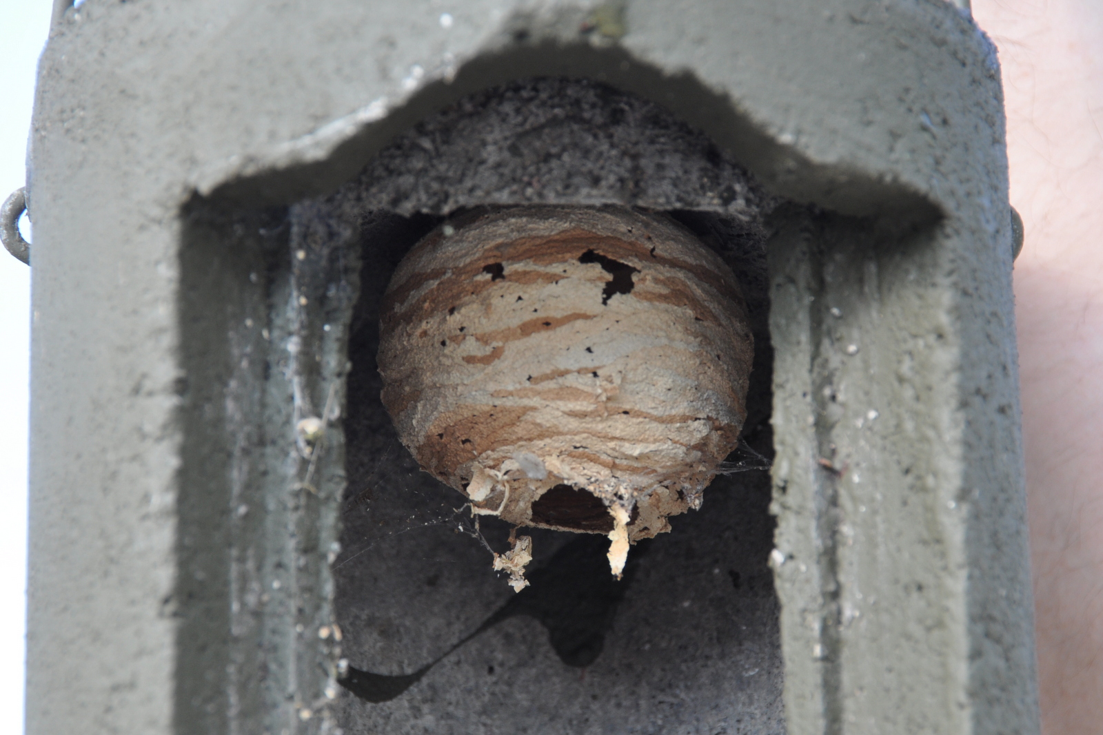 Dada por concluída a apanha, ainda houve tempo de manhã para uma acção de limpeza das caixas-ninho aqui existentes, e que neste momento são apenas duas. Estes ninhos, embora não possam apresentar credenciais de produto local, são em compensação de muito boa qualidade, pois duram (pelo menos) 3 ou 4 vezes mais do que um ninho em madeira, e as aves parecem gostar. São ninhos em cimento de madeira Schwegler (http://www.schwegler-natur.de/), distribuídos na Iberia pela Oryx (http://www.weboryx.com/). Aliás, por vezes o problema é que não são apenas as aves a gostar: gostam as vespas, gostam as formigas, gostam… Vejam esta foto: alguém nos pode esclarecer quanto ao insecto autor desta obra de arte? O material era uma casquinha muito fina e oca, e ao ser removido logo se fez em pedacinhos. A superfície quase esférica estava presa ao tecto do ninho e tinha um orifício no seu ponto mais baixo.