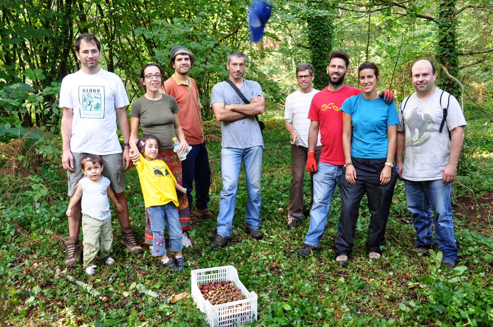 Já na mancha mais a jusante completou-se a recolha. E admiraram-se as árvores que por aqui se distribuem, numa formação não completamente nativa: tília-de-folha-pequena, tília-de-folha-grande, bordo, faia, azevinho, e claro, o castanheiro e o carvalho. Foi aqui que se tirou esta foto-de-família: