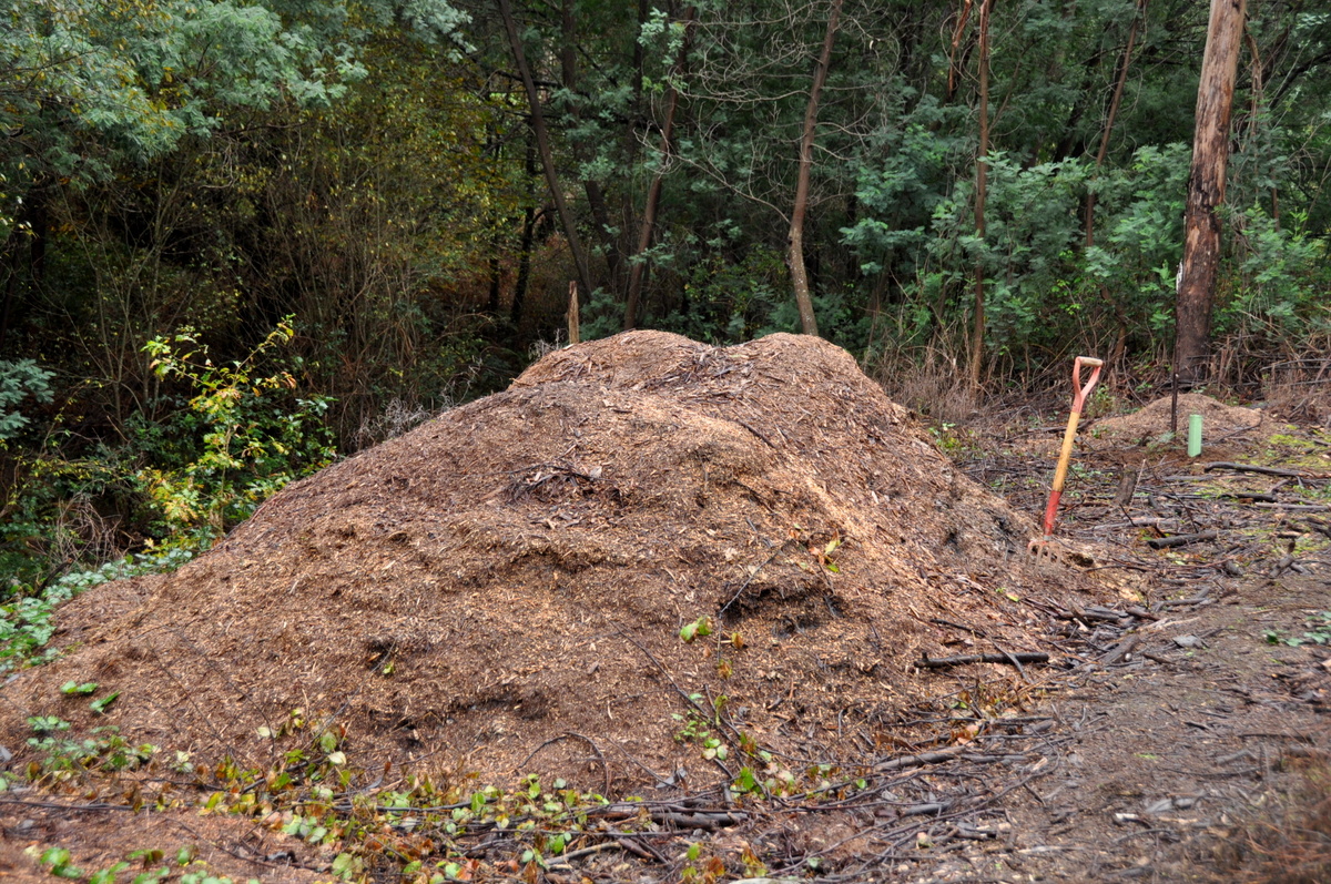 1ª etapa: zona da Ribeira do Tojo, junto ao Ribeiro, num espaço onde existia um mimosal, cortado em Julho último por uma equipa da AFBV (https://ecosanto.wordpress.com/2014/08/13/remocao-e-aproveitamento-de-uma-mancha-de-mimosas/). Recorde-se que este corte deu origem a um monte de ramada triturada. Mas antes de começar, a equipa deu uma vista de olhos a um núcleo de medronheiros plantados ali ao lado no último Inverno, núcleo que apresentava o interesse especial de se encontrar num solo com características idênticas ao que se esperava encontrar hoje: seco, pedregoso e com muitas raízes de mimosa. Mas o estado desses medronheiros surpreendeu pela positiva: estavam bonitos e viçosos. Um deles, caso nunca visto, tinha a bonita quantidade de 6 ou 7 lagartas-do-medronheiro (Charaxes jasius), bem distribuídas pelas suas folhas. Mas nem por isso pareciam estar demasiado comidas. Outra coisa surpreendeu os voluntários, agora pela negativa: havia já mimosas por todo a área plantada, algumas com 3 a 4 metros de altura, apesar de na altura da plantação todas terem sido cortadas ou arrancadas! A maioria destas mimosas era proveniente de rebentamentos de raízes e ilustra bem os desafios do controlo desta espécie invasora numa área extensa e acidentada. A equipa não resistiu: tinha que fazer aqui 10 ou 15 minutos de trabalho de arranque de mimosas!