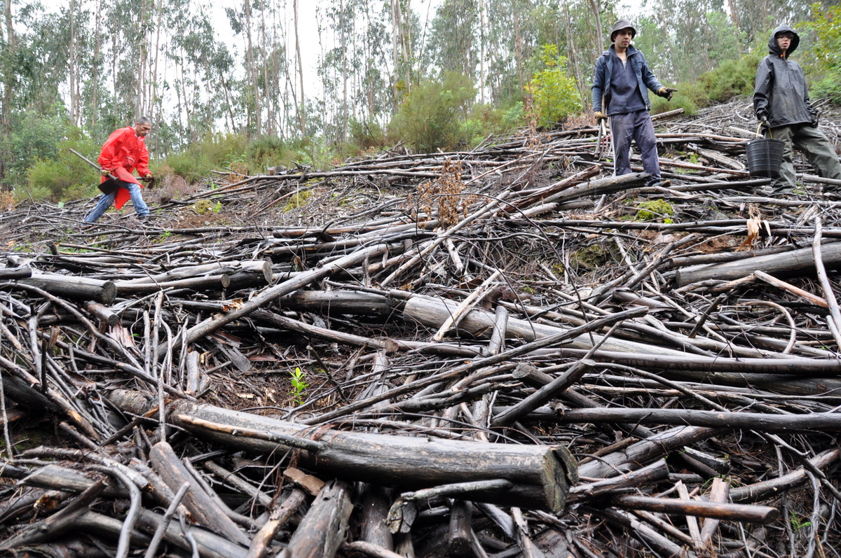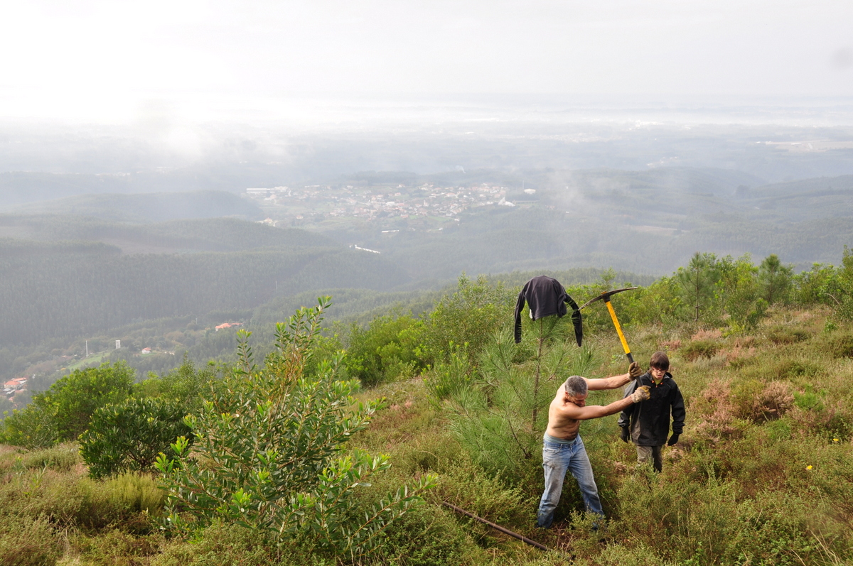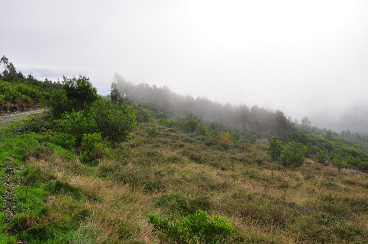Era quase hora do almoço quando a equipa subiu o monte para plantar numa área lá bem em cima, a cerca de 400 m de altitude, na cabeceira do vale nº 2. O almoço teve a particularidade de ser à chuva, mas suficientemente leve para não transformar o pão em papa. Até parecia querer começar a aumentar de intensidade, de acordo com as previsões. Mas eis que, de repente, parou, e houve até um momento em que o sol fez uma fugaz aparição. A neblina começou então a subir o monte, e o horizonta das terras litorais tornou-se mais claro. Era bonito, mas… era tempo de voltar ao trabalho.