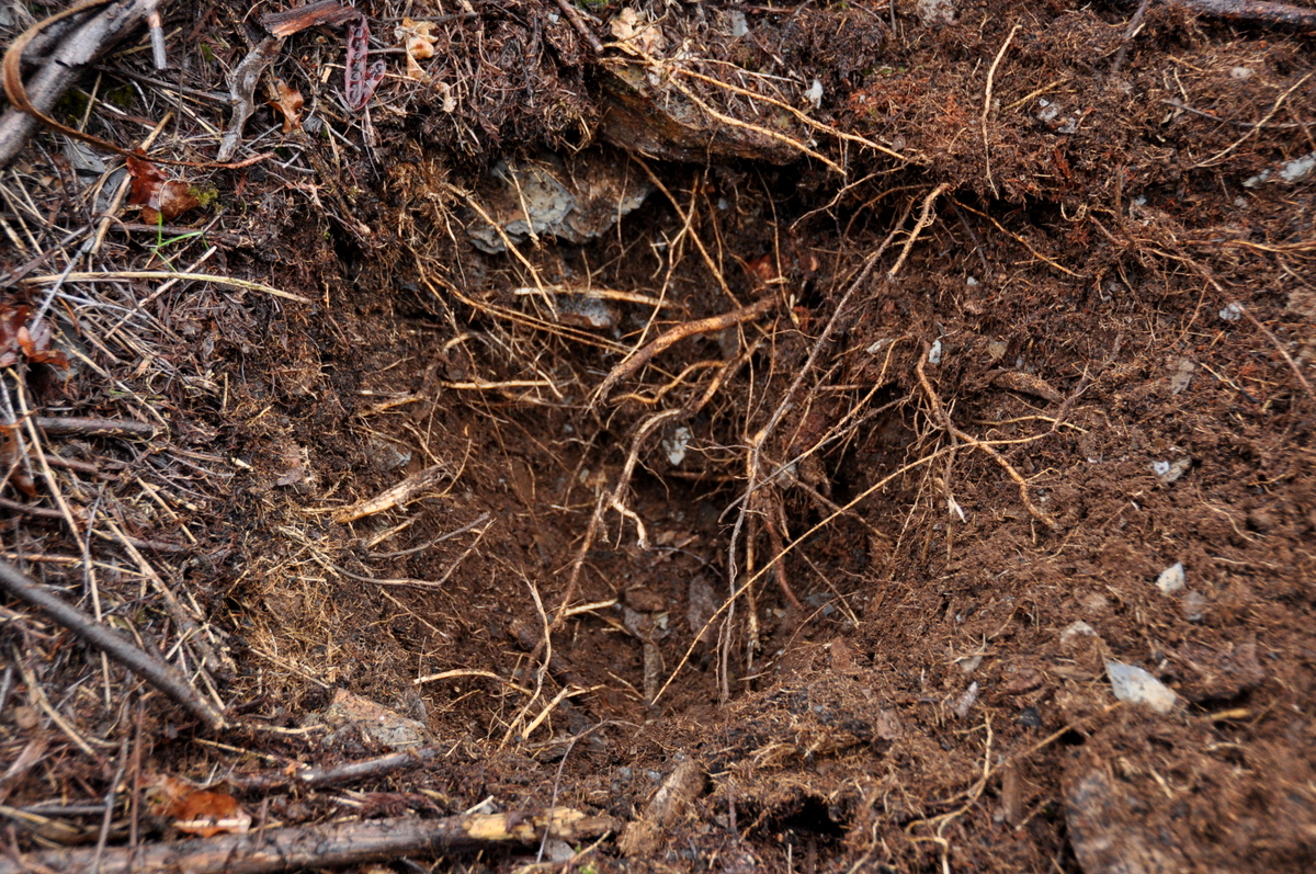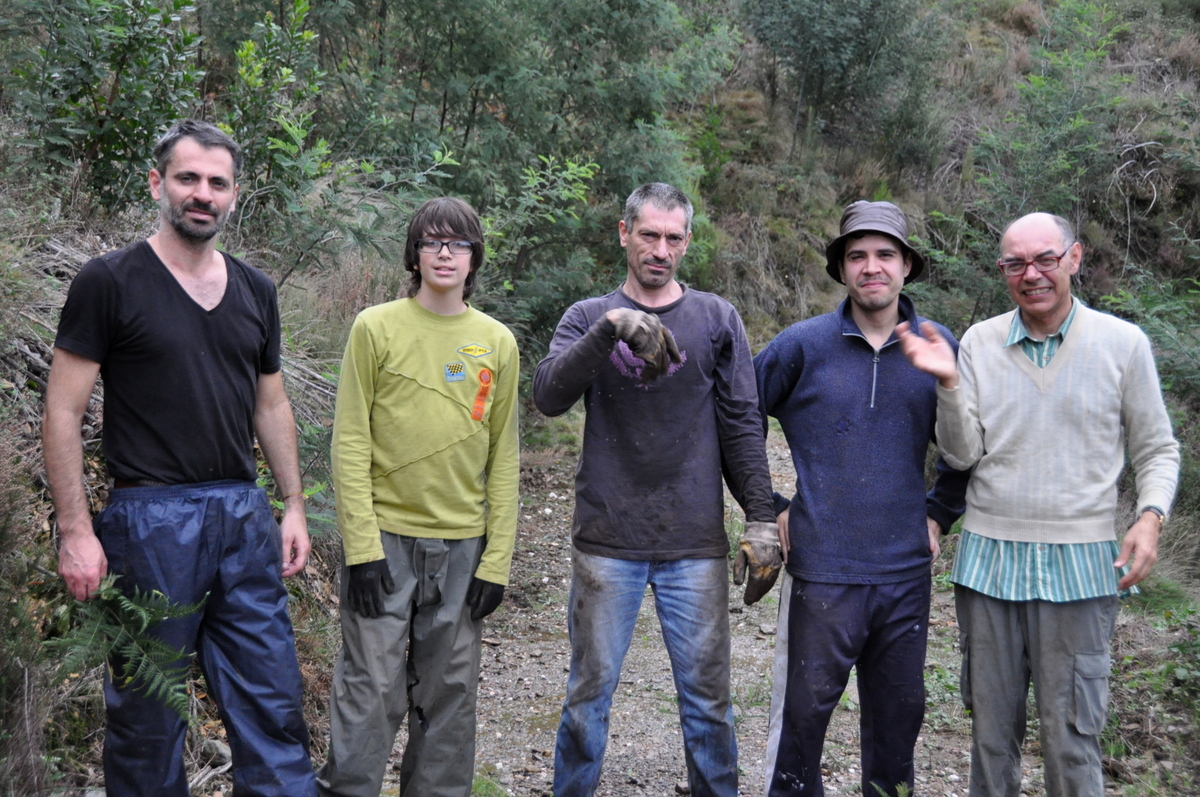 Feito o “aquecimento”, o resto da manhã foi passado a plantar medronheiros e sobreiros. Não foi, já se sabia, um trabalho fácil: o solo era pedregoso, embora o terreno não fosse muito inclinado. Mas o mais difícil de tudo foram as raízes de mimosa: formam uma malha de tal maneira densa e resistente que mesmo uma boa picareta tem dificuldade em penetrar. Mas isso já era esperado. O que não era esperado era que a chuva fosse caindo, sempre leve mas com muitos “para e volta”, ao longo de toda a manhã. Isso enlameou muito as ferramentas e as luvas, mas não “desarmou” a equipa, que só teve de vestir e despir os impermeáveis inúmeras vezes!